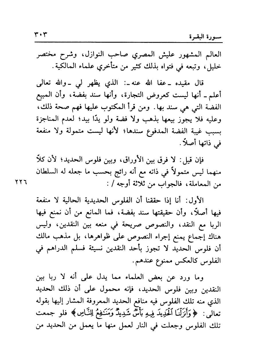 وما ورد عن بعض العلماء مما يدل على أنه لا ربا بين النقدين وبين فلوس الحديد، فإنه محمول على أن ذلك الحديد الذي منه تلك الفلوس فيه منافع الحديد المعروفة المشار إليها بقوله تعالى: {وَأَنْزَلْنَا الْحَدِيدَ فِيهِ بَأْسٌ شَدِيدٌ وَمَنَافِعُ لِلنَّاسِ} فلو جمعت تلك الفلوس وجعلت في النار لعمل منها ما يعمل من الحديد من