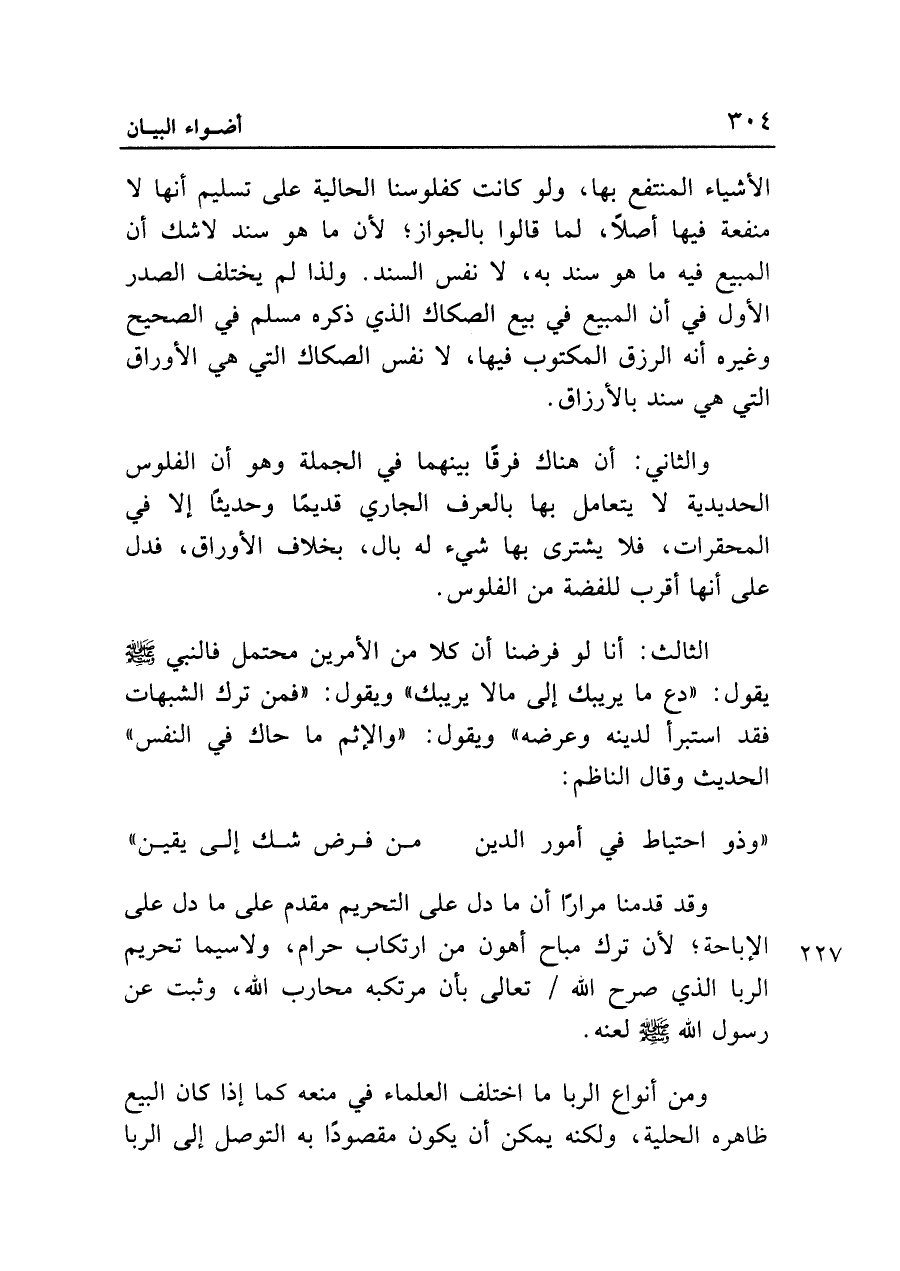 الأشياء المنتفع بها، ولو كانت كفلوسنا الحالية على تسليم أنها لا منفعة فيها أصلا، لما قالوا بالجواز؛ لأن ما هو سند لا شك أن المبيع فيه ما هو سند به، لا نفس السند. ولذا لم يختلف الصدر الأول في أن المبيع في بيع الصكاك الذي ذكره مسلم في الصحيح وغيره أنه الرزق المكتوب فيها، لا نفس الصكاك التي هي الأوراق التي هي سند بالأرزاق.