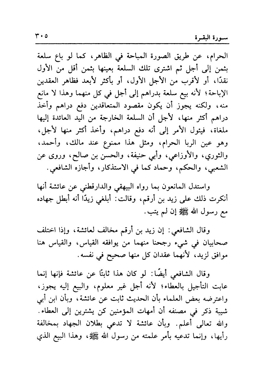 وقال الشافعي أيضا: لو كان هذا ثابتا عن عائشة فإنها إنما عابت التأجيل بالعطاء، لأنه أجل غير معلوم، والبيع إليه يجوز، واعترضه بعض العلماء بأن الحديث ثابت عن عائشة، وبأن ابن أبي شيبة ذكر في مصنفه أن أمهات المؤمنين كن يشترين إلى العطاء. والله تعالى أعلم. وبأن عائشة لا تدعي بطلان الجهاد بمخالفة رأيها، وإنما تدعيه بأمر علمته من رسول الله - صلى الله عليه وسلم -، وهذا البيع الذي
