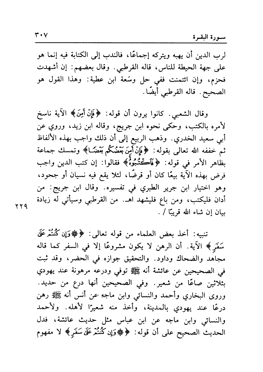 تنبيه: أخذ بعض العلماء من قوله تعالى: {وَإِنْ كُنْتُمْ عَلَى سَفَرٍ} الآية. أن الرهن لا يكون مشروعا إلا في السفر كما قاله مجاهد والضحاك وداود. والتحقيق جوازه في الحضر، وقد ثبت في الصحيحين عن عائشة أنه - صلى الله عليه وسلم - توفي ودرعه مرهونة عند يهودي بثلاثين صاعا من شعير. وفي الصحيحين أنها درع من حديد. وروى البخاري وأحمد والنسائي وابن ماجه عن أنس أنه - صلى الله عليه وسلم - رهن درعا عند يهودي بالمدينة، وأخذ منه شعيرا لأهله. ولأحمد والنسائي وابن ماجه عن ابن عباس مثل حديث عائشة، فدل الحديث الصحيح على أن قوله: {وَإِنْ كُنْتُمْ عَلَى سَفَرٍ} لا مفهوم