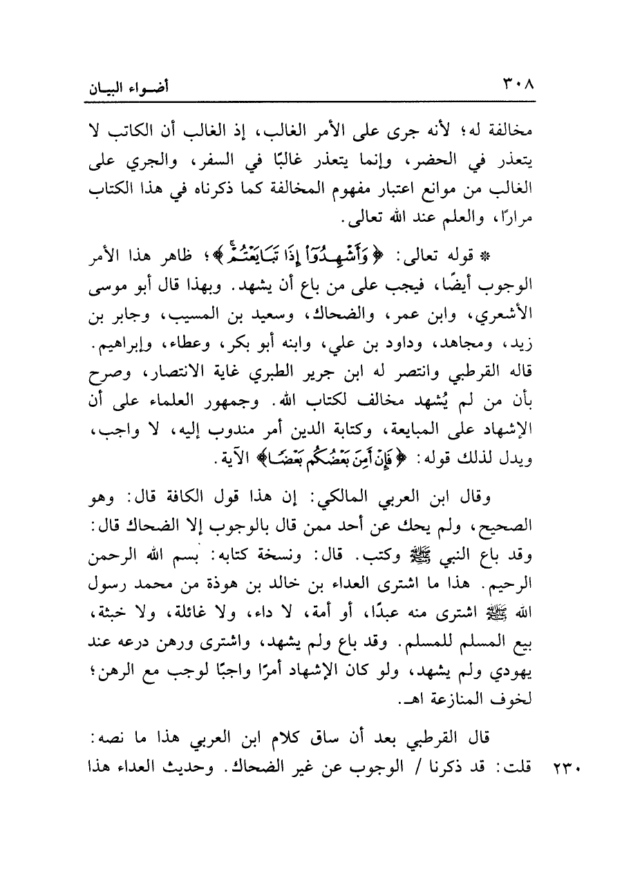 • قوله تعالى: {وَأَشْهِدُوا إِذَا تَبَايَعْتُمْ}؛ ظاهر هذا الأمر الوجوب أيضا، فيجب على من باع أن يشهد. وبهذا قال أبو موسى الأشعري، وابن عمر، والضحاك، وسعيد بن المسيب، وجابر بن زيد، ومجاهد، وداود بن علي، وابنه أبو بكر، وعطاء، وإبراهيم. قاله القرطبي وانتصر له ابن جرير الطبري غاية الانتصار، وصرح بأن من لم يشهد مخالف لكتاب الله. وجمهور العلماء على أن الإشهاد على المبايعة، وكتابة الدين أمر مندوب إليه، لا واجب، ويدل لذلك قوله: {فَإِنْ أَمِنَ بَعْضُكُمْ بَعْضاً} الآية.