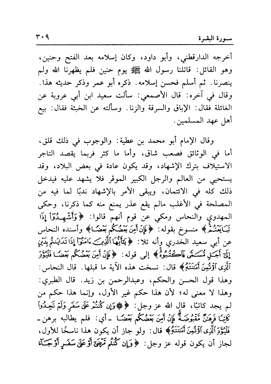 وقال الإمام أبو محمد بن عطية: والوجوب في ذلك قلق، أما في الوثائق فصعب شاق، وأما ما كثر فربما يقصد التاجر الاستيلاف بترك الإشهاد، وقد يكون عادة في بعض البلاد، وقد يستحيي من العالم والرجل الكبير الموقر فلا يشهد عليه فيدخل ذلك كله في الائتمان، ويبقى الأمر بالإشهاد ندبا لما فيه من المصلحة في الأغلب ما لم يقع عذر يمنع منه كما ذكرنا، وحكى المهدوي والنحاس ومكي عن قوم أنهم قالوا: {وَأَشْهِدُوا إِذَا تَبَايَعْتُمْ} منسوخ بقوله: {فَإِنْ أَمِنَ بَعْضُكُمْ بَعْضاً} وأسنده النحاس عن أبي سعيد الخدري وأنه تلا: {يَا أَيُّهَا الَّذِينَ آمَنُوا إِذَا تَدَايَنْتُمْ بِدَيْنٍ إِلَى أَجَلٍ مُسَمّىً فَاكْتُبُوهُ} إلى قوله: {فَإِنْ أَمِنَ بَعْضُكُمْ بَعْضاً فَلْيُؤَدِّ الَّذِي اؤْتُمِنَ أَمَانَتَهُ} قال: نسخت هذه الآية ما قبلها. قال النحاس: وهذا قول الحسن والحكم، وعبد الرحمن بن زيد. قال الطبري: وهذا لا معنى له؛ لأن هذا حكم غير الأول، وإنما هذا حكم من لم يجد كاتبا، قال الله عز وجل: {وَإِنْ كُنْتُمْ عَلَى سَفَرٍ وَلَمْ تَجِدُوا كَاتِباً فَرِهَانٌ مَقْبُوضَةٌ فَإِنْ أَمِنَ بَعْضُكُمْ بَعْضاً} -أي: فلم يطالبه برهن- {فَلْيُؤَدِّ الَّذِي اؤْتُمِنَ أَمَانَتَهُ} قال: ولو جاز أن يكون هذا ناسخا للأول، لجاز أن يكون قوله عز وجل: {وَإِنْ كُنْتُمْ مَرْضَى أَوْ عَلَى سَفَرٍ أَوْ جَاءَ