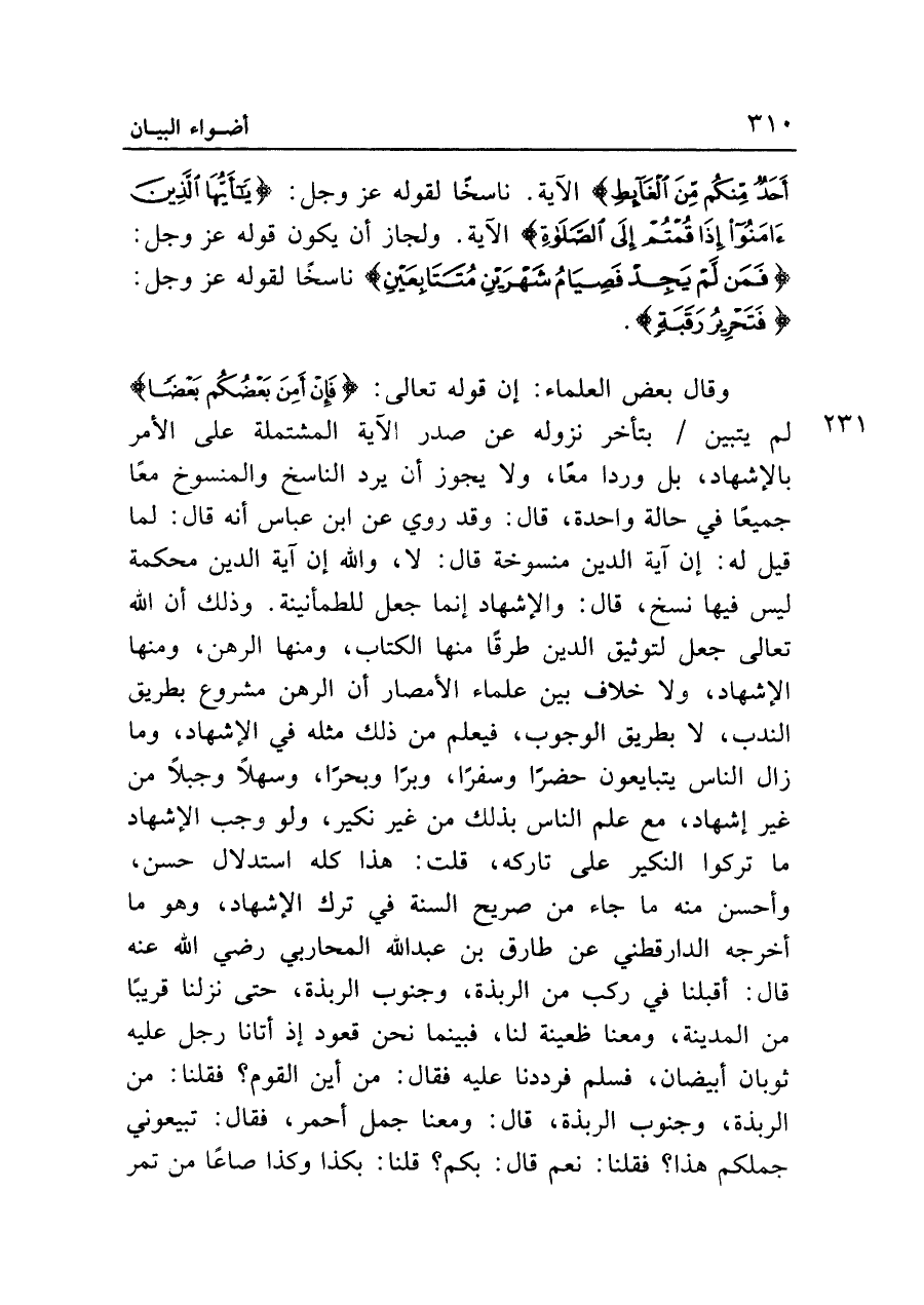 وقال بعض العلماء: إن قوله تعالى: {فَإِنْ أَمِنَ بَعْضُكُمْ بَعْضاً} لم يتبين بتأخر نزوله عن صدر الآية المشتملة على الأمر بالإشهاد، بل وردا معا، ولا يجوز أن يرد الناسخ والمنسوخ معا جميعا في حالة واحدة، قال: وقد روي عن ابن عباس أنه قال: لما قيل له: إن آية الدين منسوخة قال: لا، والله إن آية الدين محكمة ليس فيها نسخ، قال: والإشهاد إنما جعل للطمأنينة. وذلك أن الله تعالى جعل لتوثيق الدين طرقا منها الكتاب، ومنها الرهن، ومنها الإشهاد، ولا خلاف بين علماء الأمصار أن الرهن مشروع بطريق الندب، لا بطريق الوجوب، فيعلم من ذلك مثله في الإشهاد، وما زال الناس يتبايعون حضرا وسفرا، وبرا وبحرا، وسهلا وجبلا من غير إشهاد، مع علم الناس بذلك من غير نكير، ولو وجب الإشهاد ما تركوا النكير على تاركه، قلت: هذا كله استدلال حسن، وأحسن منه ما جاء من صريح السنة في ترك الإشهاد، وهو ما أخرجه الدارقطني عن طارق بن عبد الله المحاربي رضي الله عنه قال: أقبلنا في ركب من الربذة، وجنوب الربذة، حتى نزلنا قريبا من المدينة، ومعنا ظعينة لنا، فبينما نحن قعود إذ أتانا رجل عليه ثوبان أبيضان، فسلم فرددنا عليه فقال: من أين القوم؟ فقلنا: من الربذة، وجنوب الربذة، قال: ومعنا جمل أحمر، فقال: تبيعوني جملكم هذا؟ فقلنا: نعم قال: بكم؟ قلنا: بكذا وكذا صاعا من تمر