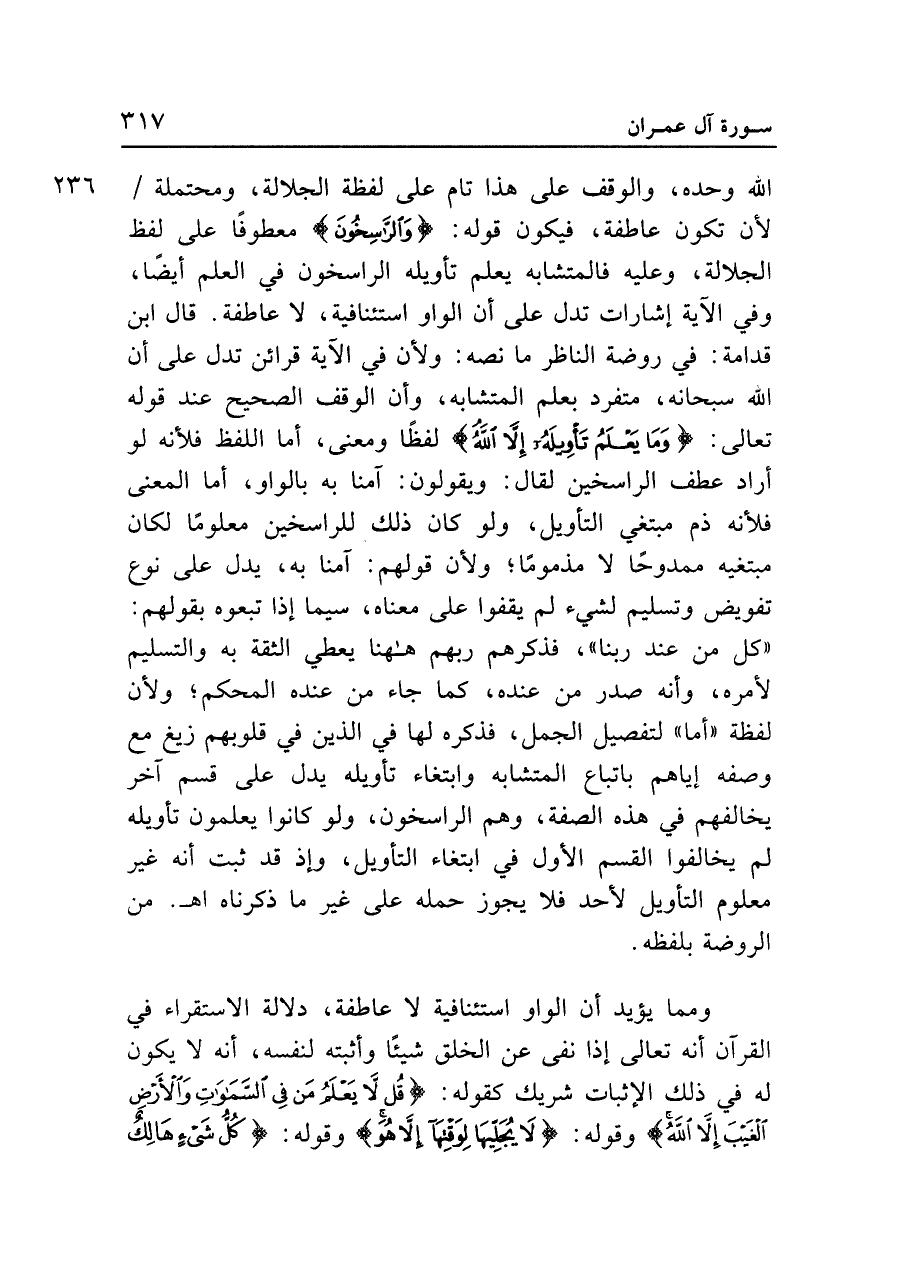 الله وحده، والوقف على هذا تام على لفظة الجلالة، ومحتملة لأن تكون عاطفة، فيكون قوله: {وَالرَّاسِخُونَ} معطوفا على لفظ الجلالة، وعليه فالمتشابه يعلم تأويله الرَّاسِخُونَ فِي الْعِلْمِ أيضا، وفي الآية إشارات تدل على أن الواو استئنافية، لا عاطفة. قال ابن قدامة: في روضة الناظر ما نصه: ولأن في الآية قرائن تدل على أن الله سبحانه، متفرد بعلم المتشابه، وأن الوقف الصحيح عند قوله تعالى: {وَمَا يَعْلَمُ تَأْوِيلَهُ إِلَّا اللَّهُ} لفظا ومعنى، أما اللفظ فلأنه لو أراد عطف الراسخين لقال: ويقولون: آمنا به بالواو، أما المعنى فلأنه ذم مبتغى التأويل، ولو كان ذلك للراسخين معلوما لكان مبتغيه ممدوحا لا مذموما؛ ولأن قولهم: آمَنَّا بِهِ، يدل على نوع تفويض وتسليم لشيء لم يقفوا على معناه، سيما إذا تبعوه بقولهم: "كُلٌّ مِنْ عِنْدِ رَبِّنَا"، فذكرهم ربهم ها هنا يعطي الثقة به والتسليم لأمره، وأنه صدر من عنده، كما جاء من عنده المحكم؛ ولأن لفظة "أما" لتفصيل الجمل، فذكره لها في الَّذِينَ فِي قُلُوبِهِمْ زَيْغٌ مع وصفة إياهم باتباع المتشابه وَابْتِغَاءَ تَأْوِيلِهِ يدل على قسم آخر يخالفهم في هذه الصفة، وهم الراسخون، ولو كانوا يعلمون تأويله لم يخالفوا القسم الأول في ابتغاء التأويل، وإذ قد ثبت أنه غير معلوم التأويل لأحد فلا يجوز حمله على غير ما ذكرناه اهـ. من الروضة بلفظه.