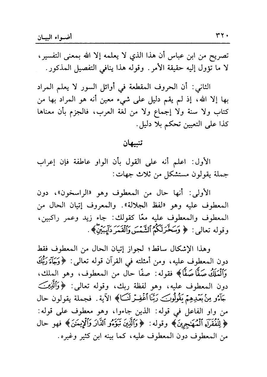 وهذا الإشكال ساقط؛ لجواز إتيان الحال من المعطوف فقط دون المعطوف عليه، ومن أمثلته في القرآن قوله تعالى: {وَجَاءَ رَبُّكَ وَالْمَلَكُ صَفّاً صَفّاً (٢٢)} فقوله: صَفّاً حال من المعطوف، وهو الْمَلَكُ، دون المعطوف عليه، وهو لفظة رَبُّكَ، وقوله تعالى: {وَالَّذِينَ جَاءُوا مِنْ بَعْدِهِمْ يَقُولُونَ رَبَّنَا اغْفِرْ لَنَا} الآية. فجملة يَقُولُونَ حال من واو الفاعل في قوله: الَّذِينَ جَاءُوا، وهو معطوف على قوله: {لِلْفُقَرَاءِ الْمُهَاجِرِينَ} وقوله: {وَالَّذِينَ تَبَوَّءُوا الدَّارَ وَالْأِيمَانَ} فهو حال من المعطوف دون المعطوف عليه، كما بينه ابن كثير وغيره.