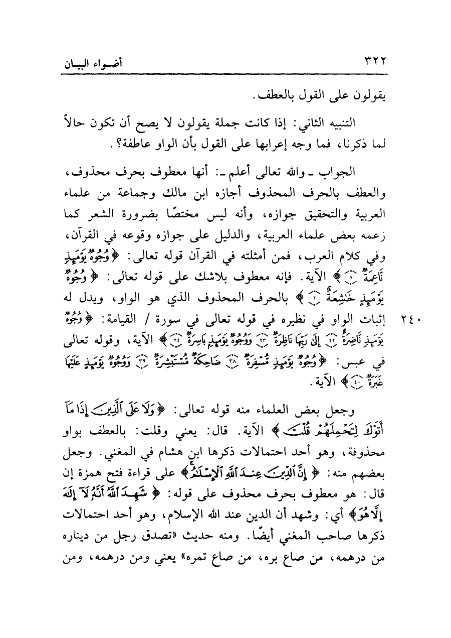 وجعل بعض العلماء منه قوله تعالى: {وَلا عَلَى الَّذِينَ إِذَا مَا أَتَوْكَ لِتَحْمِلَهُمْ قُلْتَ} الآية. قال: يعني وقلت: بالعطف بواو محذوفة، وهو أحد احتمالات ذكرها ابن هشام في المغني. وجعل بعضهم منه: {إِنَّ الدِّينَ عِنْدَ اللَّهِ الْأِسْلامُ} على قراءة فتح همزة إن قال: هو معطوف بحرف محذوف على قوله: {شَهِدَ اللَّهُ أَنَّهُ لا إِلَهَ إِلَّا هُوَ} أي: وشهد أن الدين عند الله الإسلام، وهو أحد احتمالات ذكرها صاحب المغني أيضا. ومنه حديث "تصدق رجل من ديناره من درهمه، من صاع بره، من صاع تمره" يعني ومن درهمه، ومن