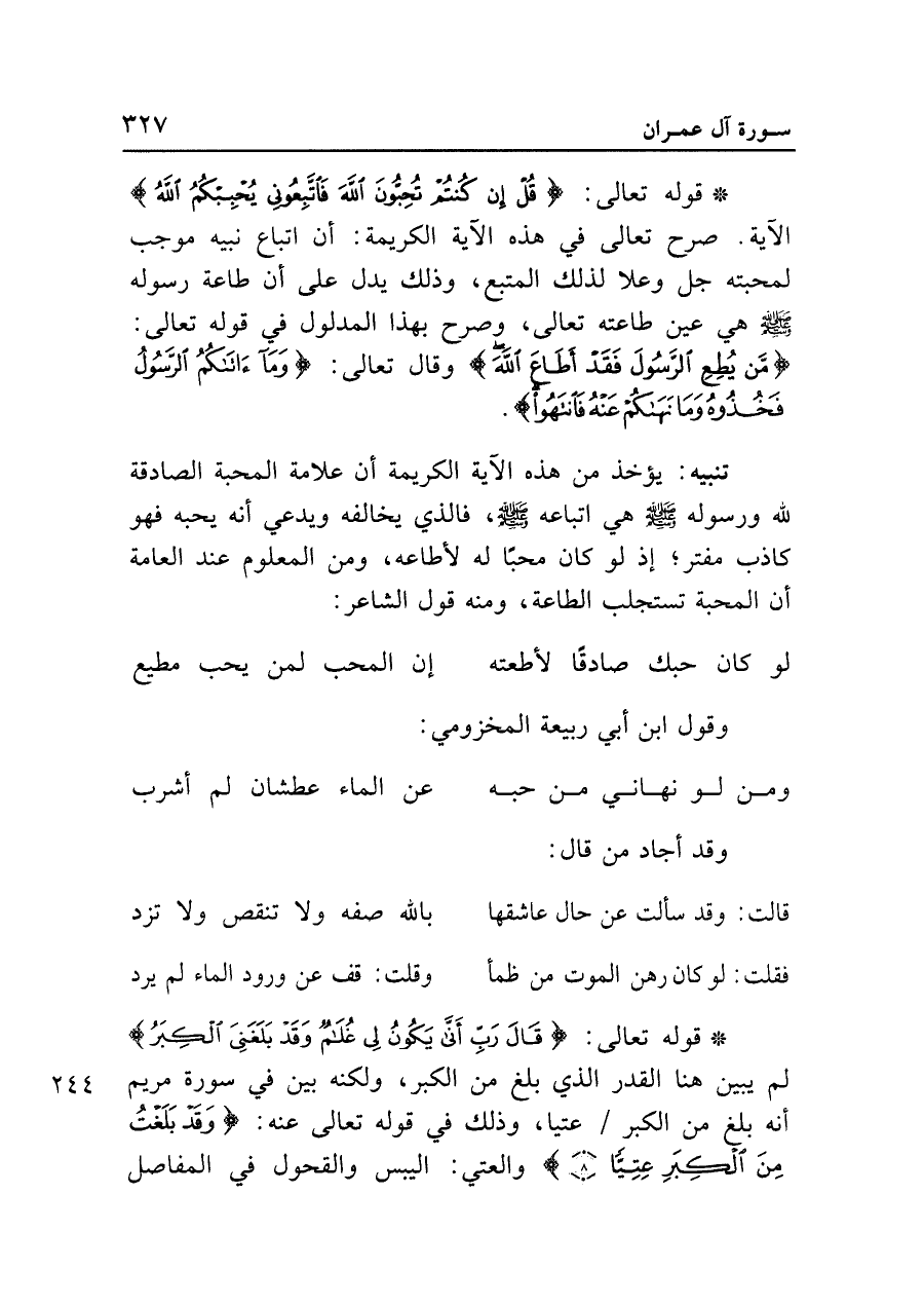 • قوله تعالى: {قُلْ إِنْ كُنْتُمْ تُحِبُّونَ اللَّهَ فَاتَّبِعُونِي يُحْبِبْكُمُ اللَّهُ} الآية. صرح تعالى في هذه الآية الكريمة: أن اتباع نبيه موجب لمحبته جل وعلا لذلك المتبع، وذلك يدل على أن طاعة رسوله - صلى الله عليه وسلم - هي عين طاعته تعالى، وصرح بهذا المدلول في قوله تعالى: {مَنْ يُطِعِ الرَّسُولَ فَقَدْ أَطَاعَ اللَّهَ} وقال تعالى: {وَمَا آتَاكُمُ الرَّسُولُ فَخُذُوهُ وَمَا نَهَاكُمْ عَنْهُ فَانْتَهُوا}.