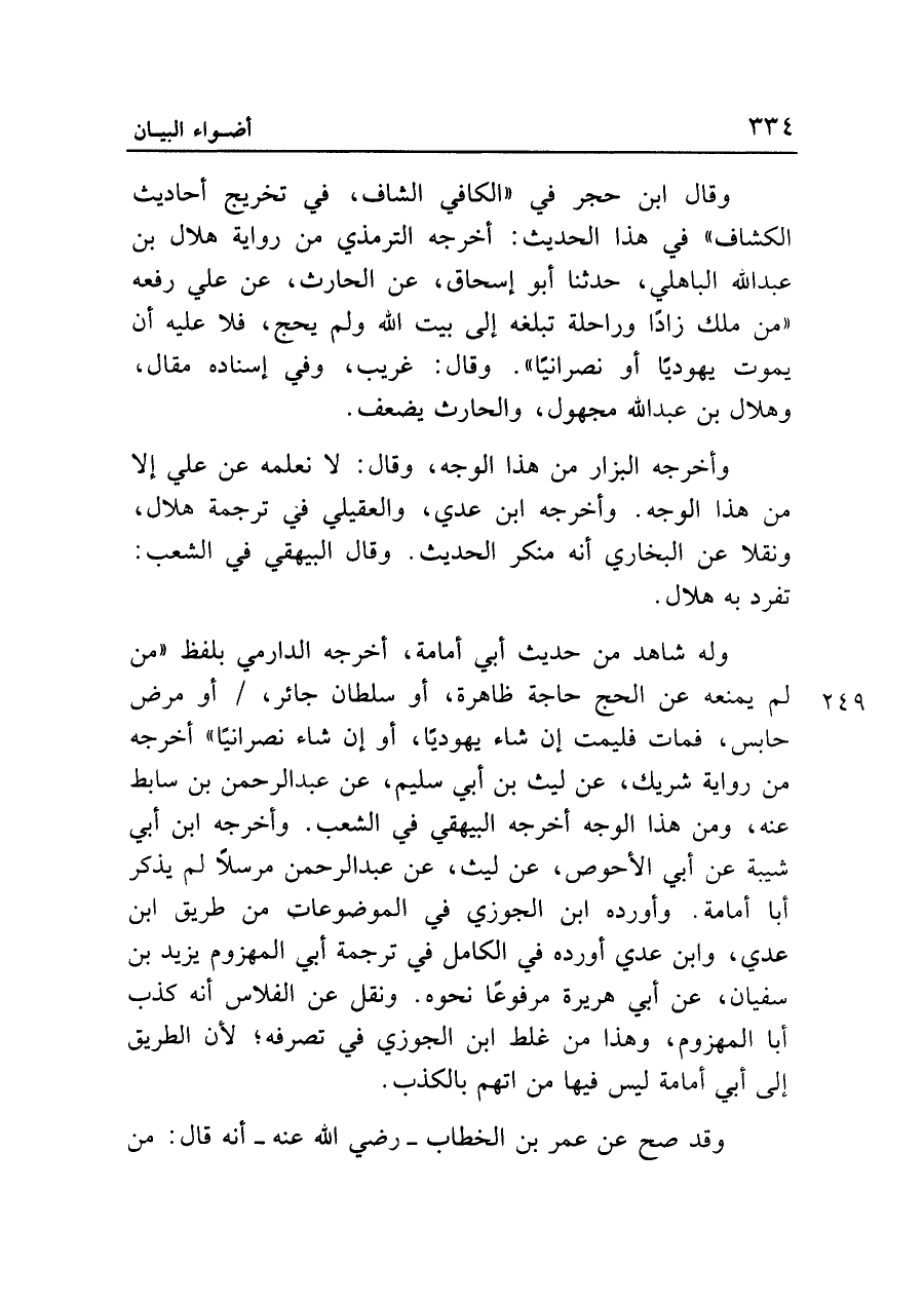وقال ابن حجر في "الكافي الشاف، في تخريج أحاديث الكشاف" في هذا الحديث: أخرجه الترمذي من رواية هلال بن عبد الله الباهلي، حدثنا إبو أسحاق، عن الحارث، عن علي رفعه "من ملك زادا وراحلة تبلغه إلى بيت الله ولم يحج، فلا عليه أن يموت يهوديا أو نصرانيا". وقال: غريب، وفي إسناده مقال، وهلال بن عبد الله مجهول، والحارث يضعف.