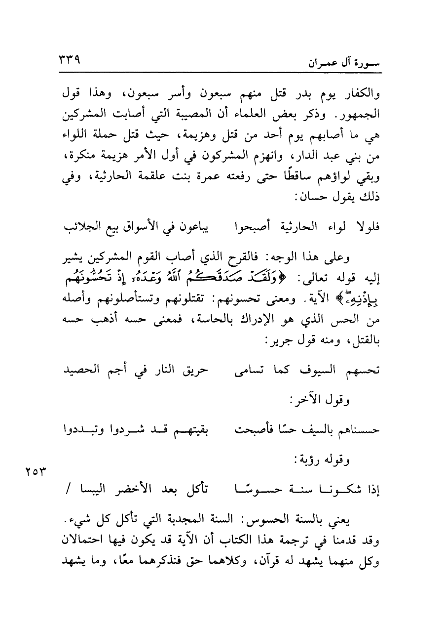 وعلى هذا الوجه: فالقرح الذي أصاب القوم المشركين يشير إليه قوله تعالى: {وَلَقَدْ صَدَقَكُمُ اللَّهُ وَعْدَهُ إِذْ تَحُسُّونَهُمْ بِإِذْنِهِ} الآية. ومعنى تحسونهم: تقتلونهم وتستأصلونهم وأصله من الحس الذي هو الإدراك بالحاسة، فمعنى حسه أذهب حسه بالقتل، ومنه قول جرير: