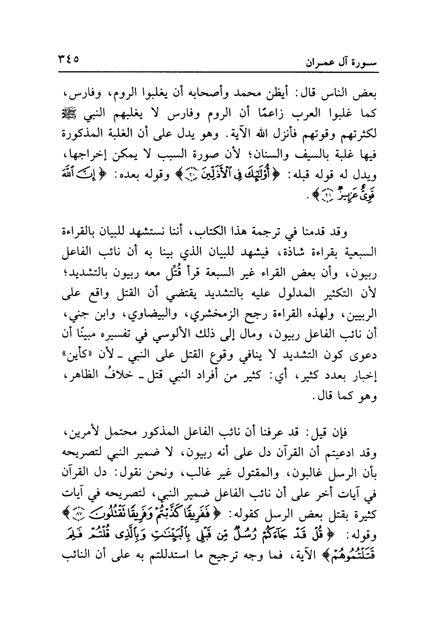 فإن قيل: قد عرفنا أن نائب الفاعل المذكور محتمل لأمرين، وقد ادعيتم أن القرآن دل على أنه ربيون، لا ضمير النبي لتصريحه بأن الرسل غالبون، والمقتول غير غالب، ونحن نقول: دل القرآن في آيات أخر على أن نائب الفاعل ضمير النبي، لتصريحه في آيات كثيرة بقتل بعض الرسل كقوله: {فَفَرِيقاً كَذَّبْتُمْ وَفَرِيقاً تَقْتُلُونَ (٨٧)} وقوله: {قُلْ قَدْ جَاءَكُمْ رُسُلٌ مِنْ قَبْلِي بِالْبَيِّنَاتِ وَبِالَّذِي قُلْتُمْ فَلِمَ قَتَلْتُمُوهُمْ} الآية، فما وجه ترجيح ما استدللتم به على أن النائب