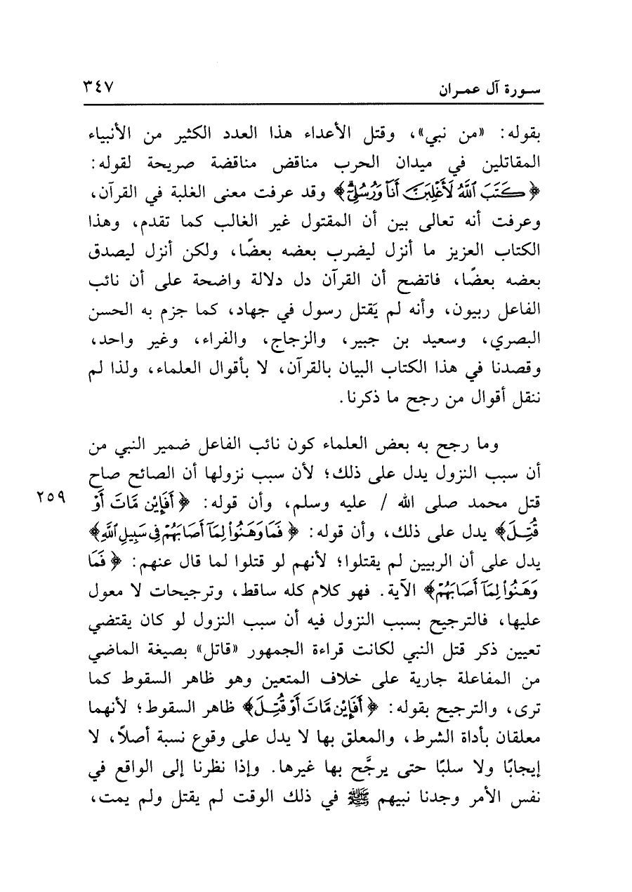 بقوله: "مِنْ نَبِيٍّ"، وقتل الأعداء هذا العدد الكثير من الأنبياء المقاتلين في ميدان الحرب مناقض مناقضة صريحة لقوله: {كَتَبَ اللَّهُ لَأَغْلِبَنَّ أَنَا وَرُسُلِي} وقد عرفت معنى الغلبة في القرآن، وعرفت أنه تعالى بين أن المقتول غير الغالب كما تقدم، وهذا الكتاب العزيز ما أنزل ليضرب بعضه بعضا، ولكن أنزل ليصدق بعضه بعضا، فاتضح أن القرآن دل دلالة واضحة على أن نائب الفاعل ربيون، وأنه لم يقتل رسول في جهاد، كما جزم به الحسن البصري، وسعيد بن جبير، والزجاج، والفراء، وغير واحد، وقصدنا في هذا الكتاب البيان بالقرآن، لا بأقوال العلماء، ولذا لم ننقل أقوال من رجح ما ذكرنا.