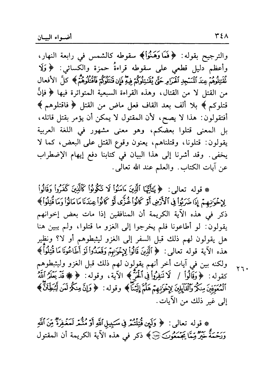 • قوله تعالى: {يَا أَيُّهَا الَّذِينَ آمَنُوا لا تَكُونُوا كَالَّذِينَ كَفَرُوا وَقَالُوا لإِخْوَانِهِمْ إِذَا ضَرَبُوا فِي الْأَرْضِ أَوْ كَانُوا غُزّىً لَوْ كَانُوا عِنْدَنَا مَا مَاتُوا وَمَا قُتِلُوا} ذكر في هذه الآية الكريمة أن المنافقين إذا مات بعض إخوانهم يقولون: لو أطاعونا فلم يخرجوا إلى الغزو ما قتلوا، ولم يبين هنا هل يقولون لهم ذلك قبل السفر إلى الغزو ليثبطوهم أو لا؟ ونظير هذه الآية قوله تعالى: {الَّذِينَ قَالُوا لإِخْوَانِهِمْ وَقَعَدُوا لَوْ أَطَاعُونَا مَا قُتِلُوا} ولكنه بين في آيات أخر أنهم يقولون لهم ذلك قبل الغزو وليثبطوهم كقوله: {وَقَالُوا لا تَنْفِرُوا فِي الْحَرِّ} الآية، وقوله: {قَدْ يَعْلَمُ اللَّهُ الْمُعَوِّقِينَ مِنْكُمْ وَالْقَائِلِينَ لِإِخْوَانِهِمْ هَلُمَّ إِلَيْنَا} وقوله: {وَإِنَّ مِنْكُمْ لَمَنْ لَيُبَطِّئَنَّ} إلى غير ذلك من الآيات.