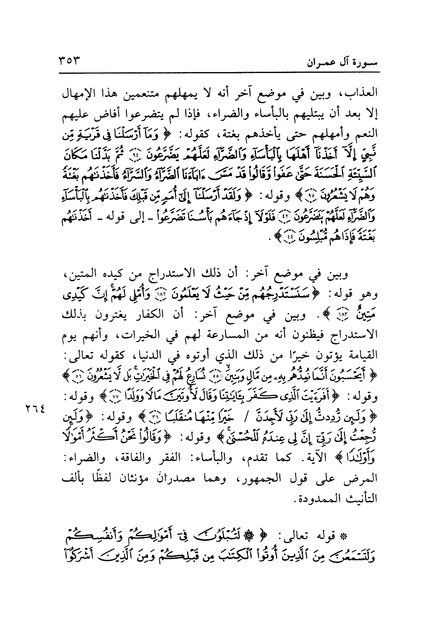 وبين في موضع آخر: أن ذلك الاستدراج من كيده المتين، وهو قوله: {سَنَسْتَدْرِجُهُمْ مِنْ حَيْثُ لا يَعْلَمُونَ (١٨٢) وَأُمْلِي لَهُمْ إِنَّ كَيْدِي مَتِينٌ (١٨٣)}. وبين في موضع آخر: أن الكفار يغترون بذلك الاستدراج فيظنون أنه من المسارعة لهم في الخيرات، وأنهم يوم القيامة يؤتون خيرا من ذلك الذي أوتوه في الدنيا، كقوله تعالى: {أَيَحْسَبُونَ أَنَّمَا نُمِدُّهُمْ بِهِ مِنْ مَالٍ وَبَنِينَ (٥٥) نُسَارِعُ لَهُمْ فِي الْخَيْرَاتِ بَلْ لا يَشْعُرُونَ (٥٦)} وقوله: {أَفَرَأَيْتَ الَّذِي كَفَرَ بِآياتِنَا وَقَالَ لَأُوتَيَنَّ مَالاً وَوَلَداً (٧٧)} وقوله: {وَلَئِنْ رُدِدْتُ إِلَى رَبِّي لَأَجِدَنَّ خَيْراً مِنْهَا مُنْقَلَباً (٣٦)} وقوله: {وَلَئِنْ رُجِعْتُ إِلَى رَبِّي إِنَّ لِي عِنْدَهُ لَلْحُسْنَى} وقوله: {وَقَالُوا نَحْنُ أَكْثَرُ أَمْوَالاً وَأَوْلاداً} الآية. كما تقدم، والبأساء: الفقر والفاقة، والضراء: المرض على قول الجمهور، وهما مصدران مؤنثان لفظا بألف التأنيث الممدودة.