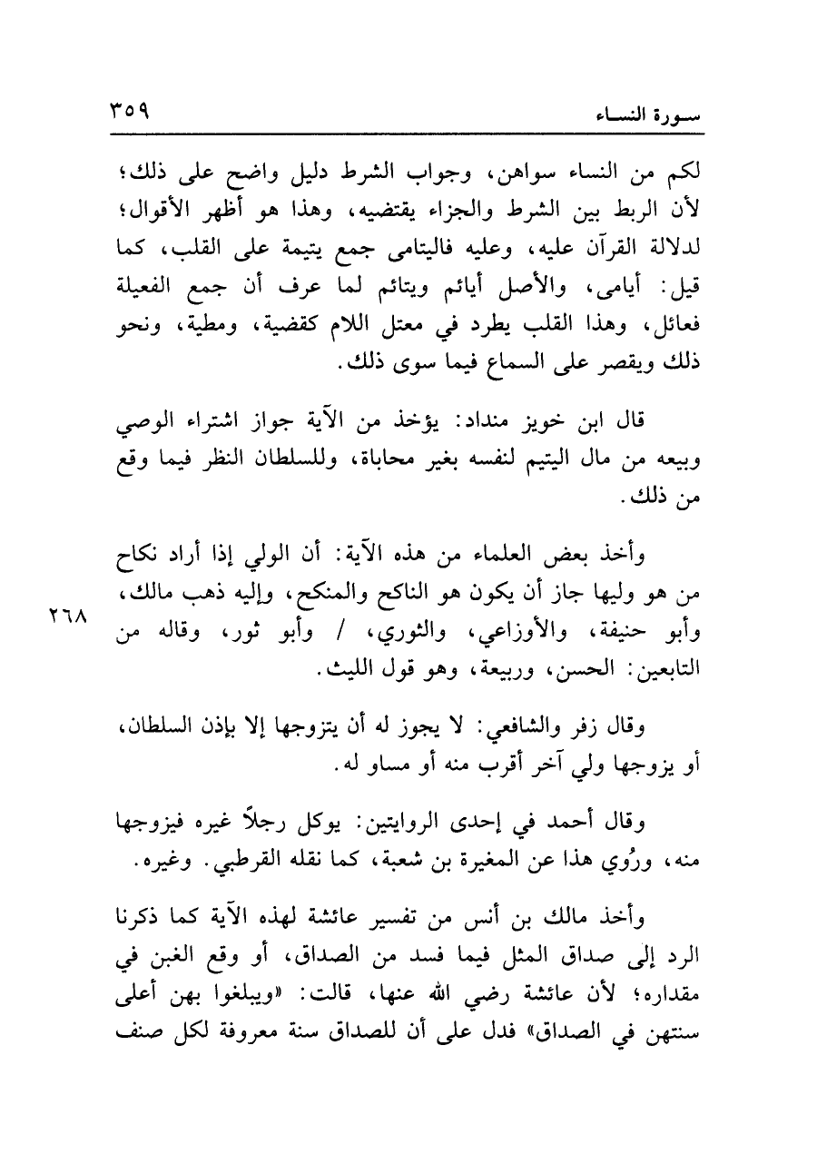 لكم من النساء سواهن، وجواب الشرط دليل واضح على ذلك؛ لأن الربط بين الشرط والجزاء يقتضيه، وهذا هو أظهر الأقوال؛ لدلالة القرآن عليه، وعليه فاليتامى جمع يتيمة على القلب، كما قيل: أيامى، والأصل أيائم ويتائم لما عرف أن جمع الفعيلة فعائل، وهذا القلب يطرد في معتل اللام كقضية، ومطية، ونحو ذلك ويقصر على السماع فيما سوى ذلك.