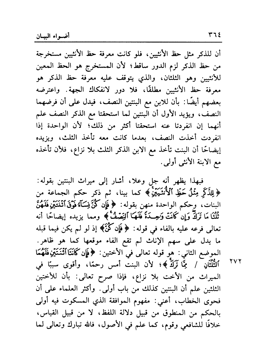 فبهذا يظهر أنه جل وعلا، أشار إلى ميراث البنتين بقوله: {لِلذَّكَرِ مِثْلُ حَظِّ الْأُنْثَيَيْنِ} كما بينا، ثم ذكر حكم الجماعة من البنات، وحكم الواحدة منهن بقوله: {فَإِنْ كُنَّ نِسَاءً فَوْقَ اثْنَتَيْنِ فَلَهُنَّ ثُلُثَا مَا تَرَكَ وَإِنْ كَانَتْ وَاحِدَةً فَلَهَا النِّصْفُ} ومما يزيده إيضاحا أنه تعالى فرعه عليه بالفاء في قوله: {فَإِنْ كُنَّ} إذ لو لم يكن فيما قبله ما يدل على سهم الإناث لم تقع الفاء موقعها كما هو ظاهر. الموضع الثاني: هو قوله تعالى في الأختين: {فَإِنْ كَانَتَا اثْنَتَيْنِ فَلَهُمَا الثُّلُثَانِ مِمَّا تَرَكَ}؛ لأن البنت أمس رحما، وأقوى سببا في الميراث من الأخت بلا نزاع، فإذا صرح تعالى: بأن للأختين الثلثين علم أن البنتين كذلك من باب أولى. وأكثر العلماء على أن فحوى الخطاب، أعني: مفهوم الموافقة الذي المسكوت فيه أولى بالحكم من المنطوق من قبيل دلالة اللفظ، لا من قبيل القياس، خلافا للشافعي وقوم، كما علم في الأصول، فالله تبارك وتعالى لما