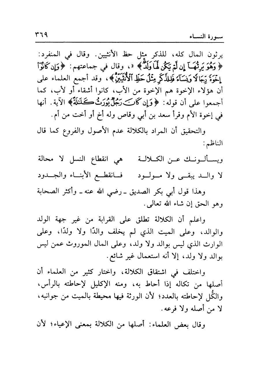 واختلف في اشتقاق الكلالة، واختار كثير من العلماء أن أصلها من تكاله إذا أحاط به، ومنه الإكليل لإحاطته بالرأس، والكل لإحاطته بالعدد؛ لأن الورثة فيها محيطة بالميت من جوانبه، لا من أصله ولا فرعه.