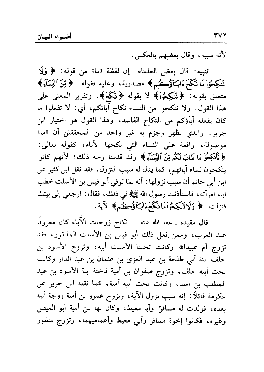 تنبيه: قال بعض العلماء: إن لفظة "مَا" من قوله: {وَلا تَنْكِحُوا مَا نَكَحَ آبَاؤُكُمْ} مصدرية، وعليه فقوله: {من النساء} متعلق بقوله: {تَنْكِحُوا} لا بقوله {نكح}، وتقرير المعنى على هذا القول: ولا تنكحوا من النساء نكاح آبائكم، أي: لا تفعلوا ما كان يفعله آباؤكم من النكاح الفاسد، وهذا القول هو اختيار ابن جرير. والذي يظهر وجزم به غير واحد من المحققين أن "مَا" موصولة، واقعة على النساء التي نكحها الآباء، كقوله تعالى: {فَانْكِحُوا مَا طَابَ لَكُمْ مِنَ النِّسَاءِ} وقد قدمنا وجه ذلك؛ لأنهم كانوا ينكحون نساء آبائهم، كما يدل له سبب النزول، فقد نقل ابن كثير عن ابن أبي حاتم أن سبب نزولها: أنه لما توفي أبو قيس بن الأسلت خطب ابنه امرأته، فاستأذنت رسول الله - صلى الله عليه وسلم - في ذلك، فقال: ارجعي إلى بيتك فنزلت: {وَلا تَنْكِحُوا مَا نَكَحَ آبَاؤُكُمْ} الآية.