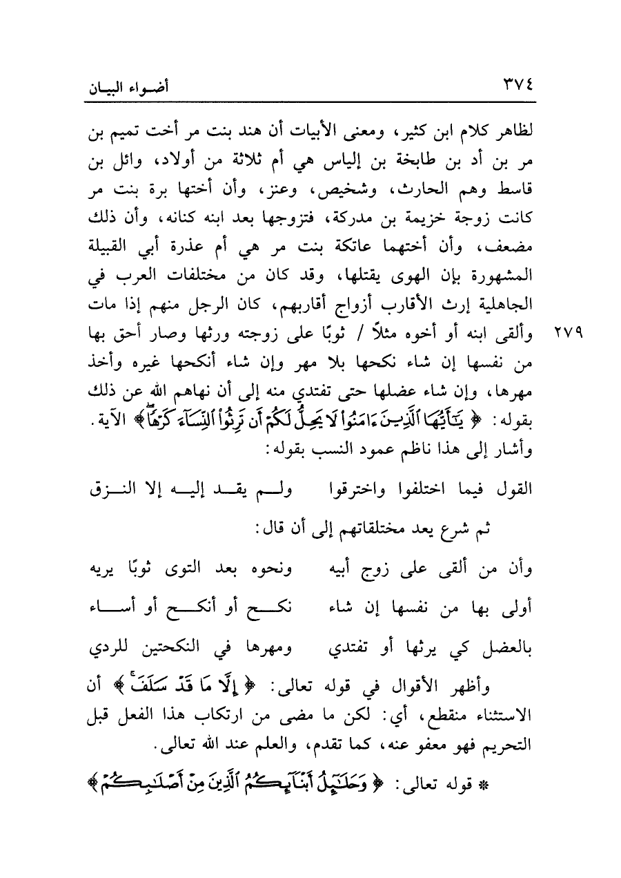 لظاهر كلام ابن كثير، ومعنى الأبيات أن هند بنت مر أخت تميم بن مر بن أد بن طابخة بن إلياس هي أم ثلاثة من أولاد، وائل بن قاسط وهم الحارث، وشخيص، وعنز، وأن أختها برة بنت مر كانت زوجة خزيمة بن مدركة، فتزوجها بعد ابنه كنانة، وأن ذلك مضعف، وأن أختهما عاتكة بنت مر هي أم عذرة أبي القبيلة المشهورة بأن الهوى يقتلها، وقد كان من مختلفات العرب في الجاهلية إرث الأقارب أزواج أقاربهم، كان الرجل منهم إذا مات وألقى ابنه أو أخوه مثلا ثوبا على زوجته ورثها وصار أحق بها من نفسها إن شاء نكحها بلا مهر وإن شاء أنكحها غيره وأخذ مهرها، وإن شاء عضلها حتى تفتدي منه إلى أن نهاهم الله عن ذلك بقوله: {يَا أَيُّهَا الَّذِينَ آمَنُوا لا يَحِلُّ لَكُمْ أَنْ تَرِثُوا النِّسَاءَ كَرْهاً} الآية.