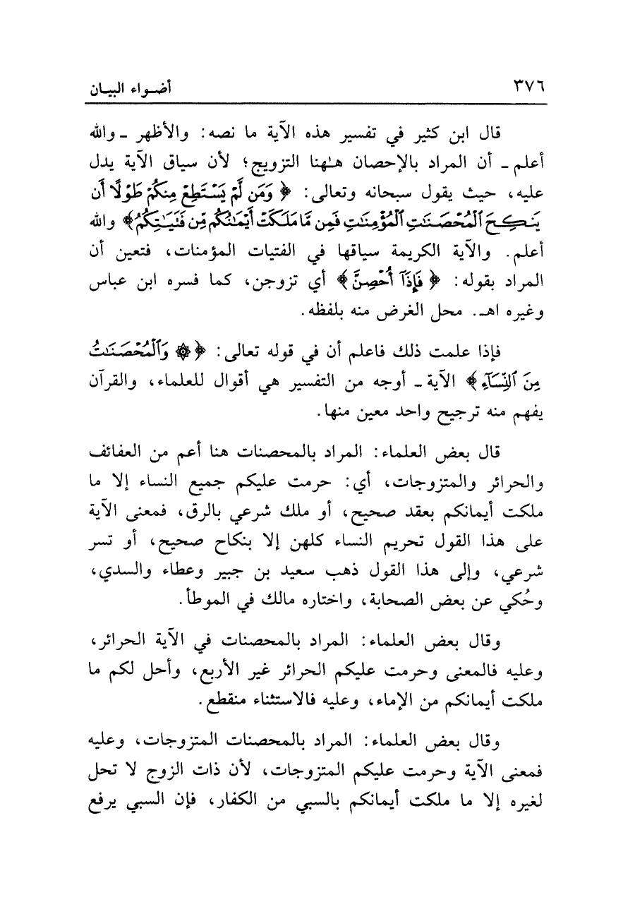 فإذا علمت ذلك فاعلم أن في قوله تعالى: {وَالْمُحْصَنَاتُ مِنَ النِّسَاءِ} الآية -أوجه من التفسير هي أقوال للعلماء، والقرآن يفهم منه ترجيح واحد معين منها.