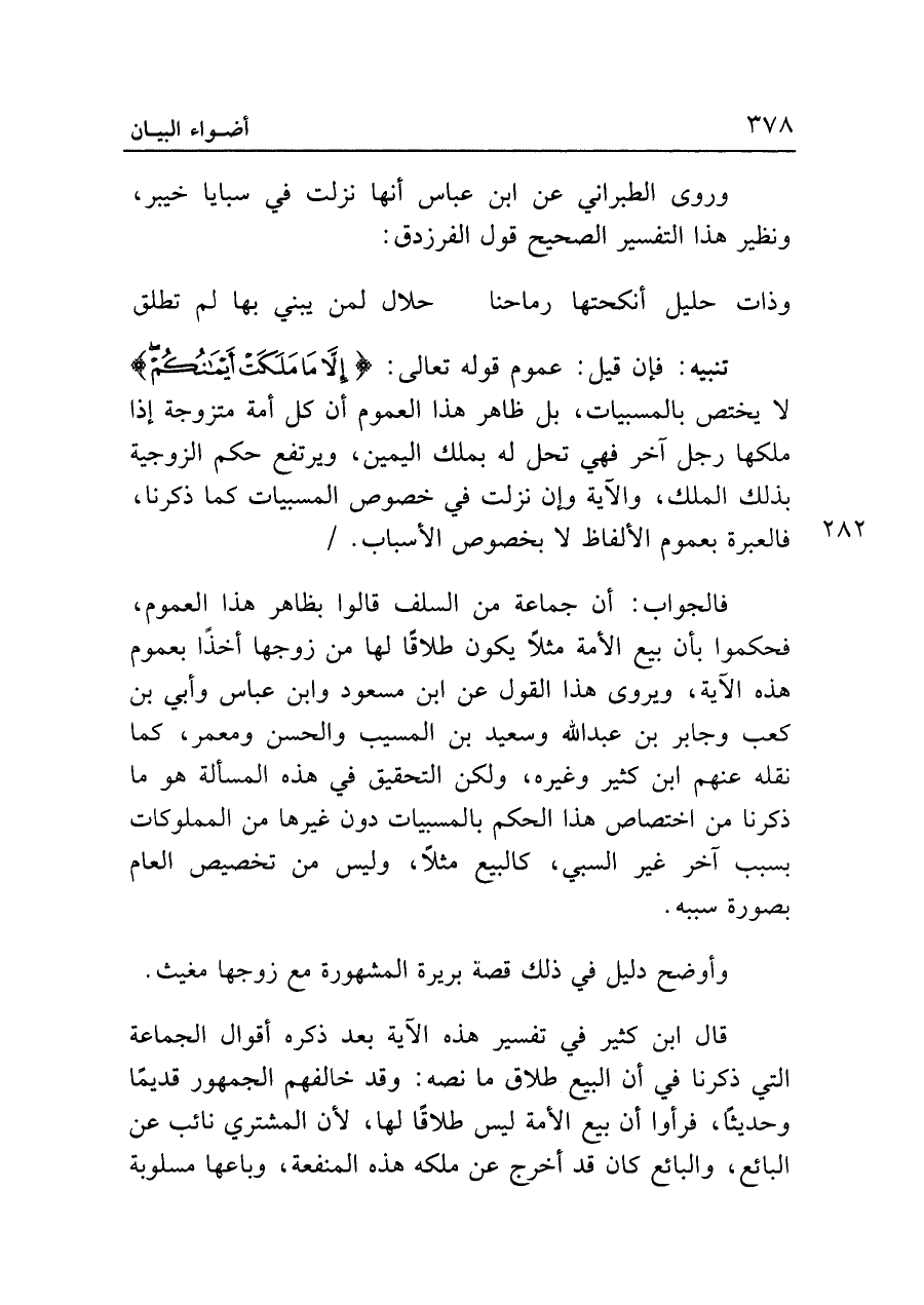 فالجواب: أن جماعة من السلف قالوا بظاهر هذا العموم، فحكموا بأن بيع الأمة مثلا يكون طلاقا لها من زوجها أخذا بعموم هذه الآية، ويروى هذا القول عن ابن مسعود وابن عباس وأبي بن كعب وجابر بن عبد الله وسعيد بن المسيب والحسن ومعمر، كما نقله عنهم ابن كثير وغيره، ولكن التحقيق في هذه المسألة هو ما ذكرنا من اختصاص هذا الحكم بالمسبيات دون غيرها من المملوكات بسبب آخر غير السبي، كالبيع مثلا، وليس من تخصيص العام بصورة سببه.