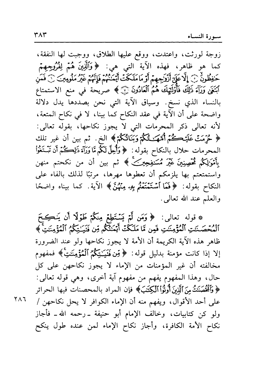 • قوله تعالى: {وَمَنْ لَمْ يَسْتَطِعْ مِنْكُمْ طَوْلاً أَنْ يَنْكِحَ الْمُحْصَنَاتِ الْمُؤْمِنَاتِ فَمِنْ مَا مَلَكَتْ أَيْمَانُكُمْ مِنْ فَتَيَاتِكُمُ الْمُؤْمِنَاتِ} ظاهر هذه الآية الكريمة أن الأمة لا يجوز نكاحها ولو عند الضرورة إلا إذا كانت مؤمنة بدليل قوله: {مِنْ فَتَيَاتِكُمُ الْمُؤْمِنَاتِ} فمفهوم مخالفته أن غير المؤمنات من الإماء لا يجوز نكاحهن على كل حال، وهذا المفهوم يفهم من مفهوم آية أخرى، وهي قوله تعالى: {وَالْمُحْصَنَاتُ مِنَ الَّذِينَ أُوتُوا الْكِتَابَ} فإن المراد بالمحصنات فيها الحرائر على أحد الأقوال، ويفهم منه أن الإماء الكوافر لا يحل نكاحهن ولو كن كتابيات، وخالف الإمام أبو حنيفة -رحمه الله- فأجاز نكاح الأمة الكافرة، وأجاز نكاح الإماء لمن عنده طول ينكح