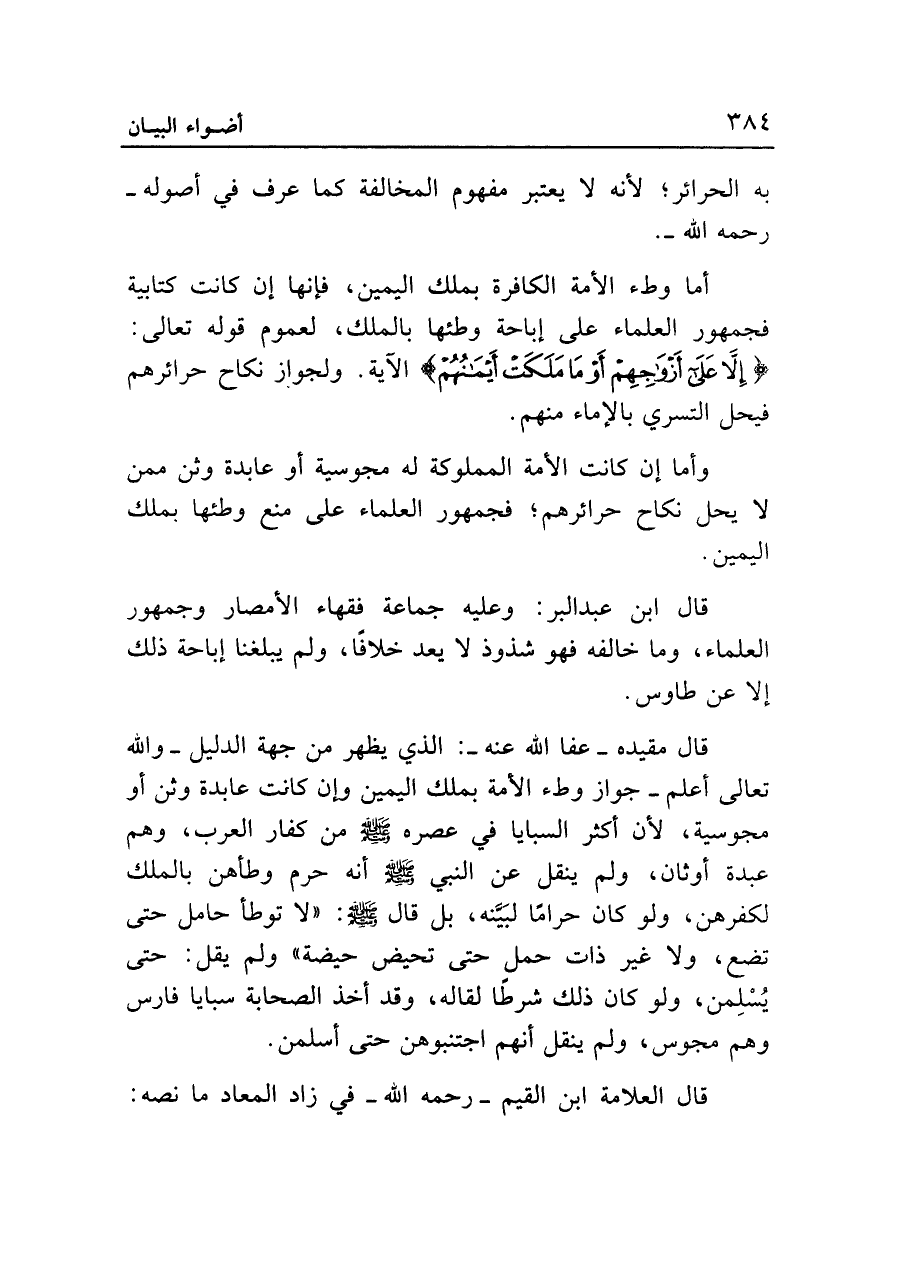 قال مقيده - عفا الله عنه -: الذي يظهر من جهة الدليل -والله تعالى أعلم- جواز وطء الأمة بملك اليمين وإن كانت عابدة وثن أو مجوسية، لأن أكثر السبايا في عصره - صلى الله عليه وسلم - من كفار العرب، وهم عبدة أوثان، ولم ينقل عن النبي - صلى الله عليه وسلم - أنه حرم وطأهن بالملك لكفرهن، ولو كان حراما لبينه، بل قال - صلى الله عليه وسلم -: "لا توطأ حامل حتى تضع، ولا غير ذات حمل حتى تحيض حيضة" ولم يقل: حتى يسلمن، ولو كان ذلك شرطا لقاله، وقد أخذ الصحابة سبايا فارس وهم مجوس، ولم ينقل أنهم اجتنبوهن حتى أسلمن.