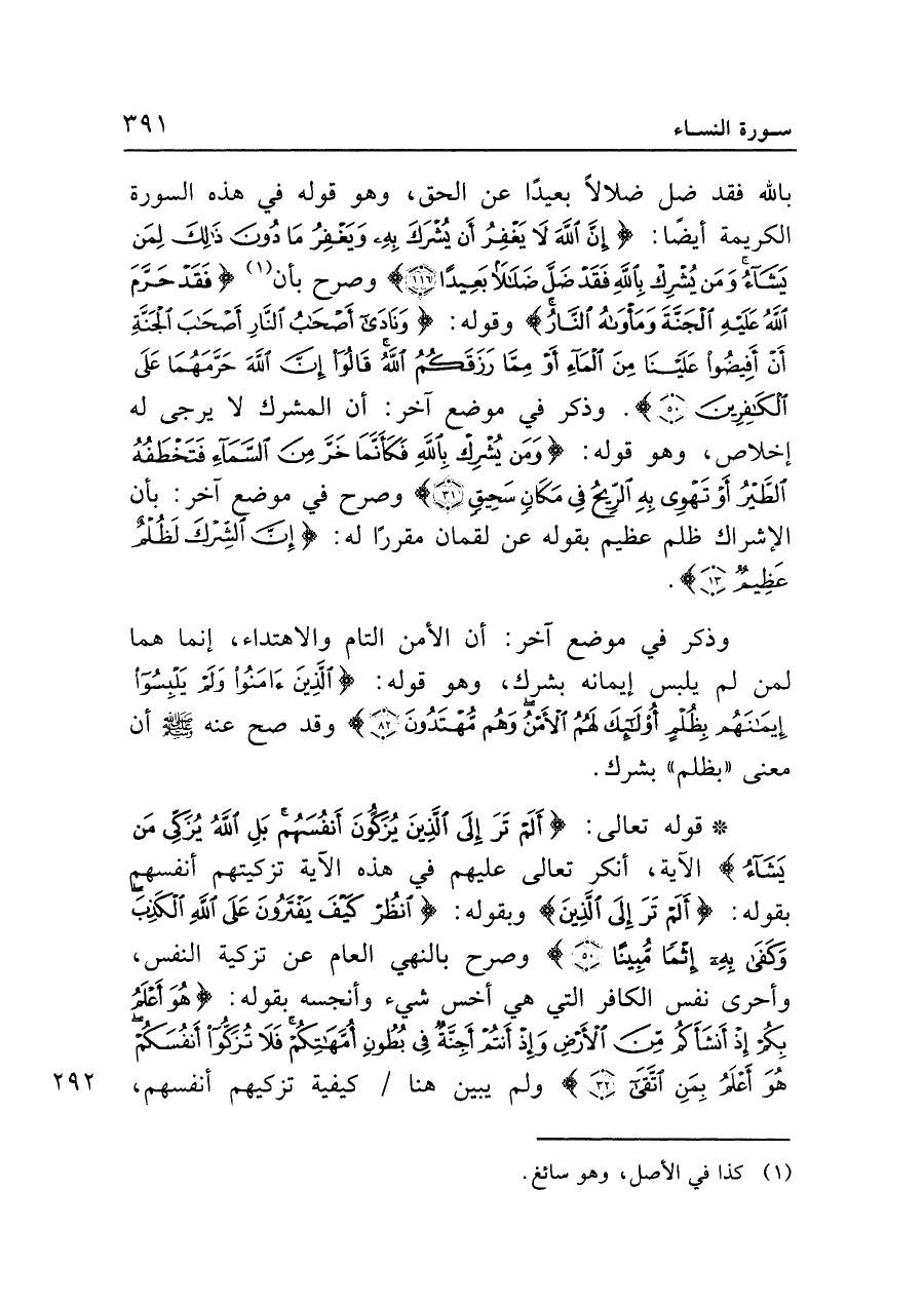 • قوله تعالى: {أَلَمْ تَرَ إِلَى الَّذِينَ يُزَكُّونَ أَنْفُسَهُمْ بَلِ اللَّهُ يُزَكِّي مَنْ يَشَاءُ} الآية، أنكر تعالى عليهم في هذه الآية تزكيتهم أنفسهم بقوله: {أَلَمْ تَرَ إِلَى الَّذِينَ} وبقوله: {انْظُرْ كَيْفَ يَفْتَرُونَ عَلَى اللَّهِ الْكَذِبَ وَكَفَى بِهِ إِثْماً مُبِيناً (٥٠)} وصرح بالنهي العام عن تزكية النفس، وأحرى نفس الكافر التي هي أخس شيء وأنجسه بقوله: {هُوَ أَعْلَمُ بِكُمْ إِذْ أَنْشَأَكُمْ مِنَ الْأَرْضِ وَإِذْ أَنْتُمْ أَجِنَّةٌ فِي بُطُونِ أُمَّهَاتِكُمْ فَلا تُزَكُّوا أَنْفُسَكُمْ هُوَ أَعْلَمُ بِمَنِ اتَّقَى (٣٢)} ولم يبين هنا كيفية تزكيهم أنفسهم،