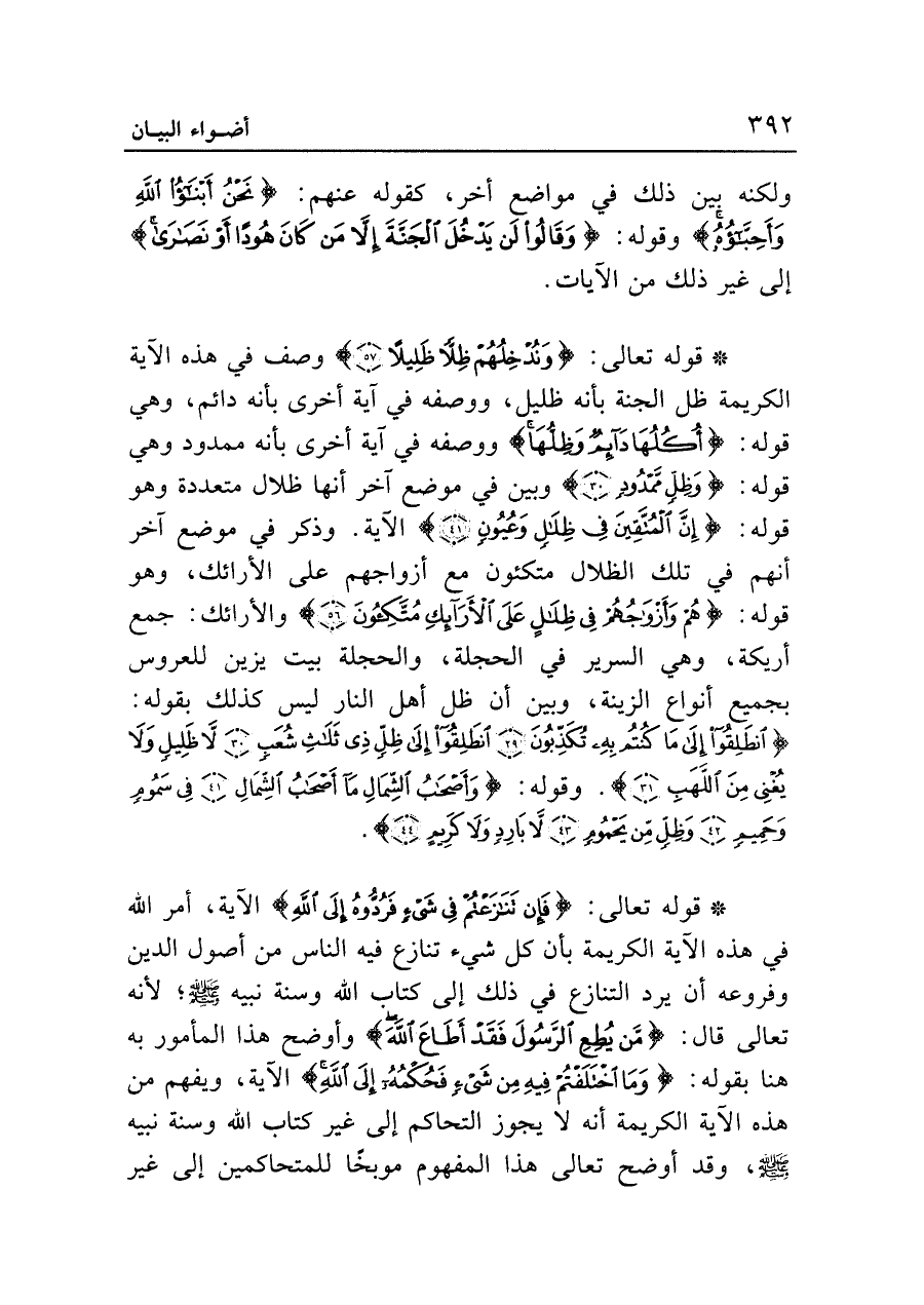 • قوله تعالى: {وَنُدْخِلُهُمْ ظِلاًّ ظَلِيلاً (٥٧)} وصف في هذه الآية الكريمة ظل الجنة بأنه ظليل، ووصفه في آية أخرى بأنه دائم، وهي قوله: {أُكُلُهَا دَائِمٌ وَظِلُّهَا} ووصفه في آية أخرى بأنه ممدود وهي قوله: {وَظِلٍّ مَمْدُودٍ (٣٠)} وبين في موضع آخر أنها ظلال متعددة وهو قوله: {إِنَّ الْمُتَّقِينَ فِي ظِلالٍ وَعُيُونٍ (٤١)} الآية. وذكر في موضع آخر أنهم في تلك الظلال متكئون مع أزواجهم على الأرائك، وهو قوله: {هُمْ وَأَزْوَاجُهُمْ فِي ظِلالٍ عَلَى الْأَرَائِكِ مُتَّكِئُونَ (٥٦)} والأرائك: جمع أريكة، وهي السرير في الحجلة، والحجلة بيت يزين للعروس بجميع أنواع الزينة، وبين أن ظل أهل النار ليس كذلك بقوله: {انْطَلِقُوا إِلَى مَا كُنْتُمْ بِهِ تُكَذِّبُونَ (٢٩) انْطَلِقُوا إِلَى ظِلٍّ ذِي ثَلاثِ شُعَبٍ (٣٠) لا ظَلِيلٍ وَلا يُغْنِي مِنَ اللَّهَبِ (٣١)}. وقوله: {وَأَصْحَابُ الشِّمَالِ مَا أَصْحَابُ الشِّمَالِ (٤١) فِي سَمُومٍ وَحَمِيمٍ (٤٢) وَظِلٍّ مِنْ يَحْمُومٍ (٤٣) لا بَارِدٍ وَلا كَرِيمٍ (٤٤)}.
