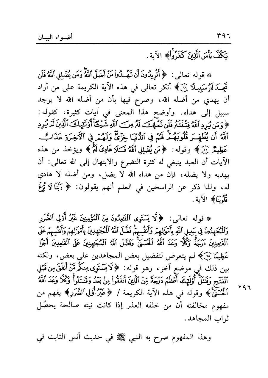 • قوله تعالى: {لا يَسْتَوِي الْقَاعِدُونَ مِنَ الْمُؤْمِنِينَ غَيْرُ أُولِي الضَّرَرِ وَالْمُجَاهِدُونَ فِي سَبِيلِ اللَّهِ بِأَمْوَالِهِمْ وَأَنْفُسِهِمْ فَضَّلَ اللَّهُ الْمُجَاهِدِينَ بِأَمْوَالِهِمْ وَأَنْفُسِهِمْ عَلَى الْقَاعِدِينَ دَرَجَةً وَكُلّاً وَعَدَ اللَّهُ الْحُسْنَى وَفَضَّلَ اللَّهُ الْمُجَاهِدِينَ عَلَى الْقَاعِدِينَ أَجْراً عَظِيماً (٩٥)} لم يتعرض لتفضيل بعض المجاهدين على بعض، ولكنه بين ذلك في موضع آخر، وهو قوله: {لَا يَسْتَوي مِنْكُمْ مَنْ أَنْفَقَ مِنْ قَبْلِ الْفَتْحِ وَقَاتَلَ أُولَئِكَ أَعْظَمُ دَرَجَةً مِنَ الَّذِينَ أَنْفَقُوا مِنْ بَعْدُ وَقَاتَلُوا وَكُلًّا وَعَدَ اللَّهُ الْحُسْنَى} وقوله في هذه الآية الكريمة {غَيرُ أُولِي الضَّرَرِ} يفهم من مفهوم مخالفته أن من خلفه العذر إذا كانت نيته صالحة يحصِّل ثواب المجاهد.