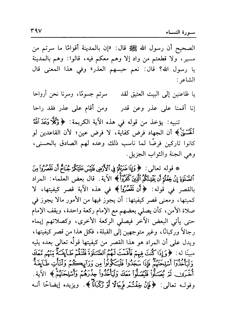 • قوله تعالى: {وَإِذَا ضَرَبْتُمْ فِي الْأَرْضِ فَلَيْسَ عَلَيْكُمْ جُنَاحٌ أَنْ تَقْصُرُوا مِنَ الصَّلاةِ إِنْ خِفْتُمْ أَنْ يَفْتِنَكُمُ الَّذِينَ كَفَرُوا} الآية. قال بعض العلماء: المراد بالقصر في قوله: {أَنْ تَقْصُرُوا} في هذه الآية قصر كيفيتها، لا كميتها، ومعنى قصر كيفيتها: أن يجوز فيها من الأمور ما لا يجوز في صلاة الأمن، كأن يصلي بعضهم مع الإمام ركعة واحدة، ويقف الإمام حتى يأتي البعض الآخر فيصلي الركعة الأخرى، وكصلاتهم إيماء رجالا وركبانا، وغير متوجهين إلى القبلة، فكل هذا من قصر كيفيتها، ويدل على أن المراد هو هذا القصر من كيفيتها قوله تعالى بعده يليه مبينا له: {وَإِذَا كُنْتَ فِيهِمْ فَأَقَمْتَ لَهُمُ الصَّلاةَ فَلْتَقُمْ طَائِفَةٌ مِنْهُمْ مَعَكَ وَلْيَأْخُذُوا أَسْلِحَتَهُمْ فَإِذَا سَجَدُوا فَلْيَكُونُوا مِنْ وَرَائِكُمْ وَلْتَأْتِ طَائِفَةٌ أُخْرَى لَمْ يُصَلُّوا فَلْيُصَلُّوا مَعَكَ وَلْيَأْخُذُوا حِذْرَهُمْ وَأَسْلِحَتَهُمْ} الآية. وقوله تعالى: {فَإِنْ خِفْتُمْ فَرِجَالًا أَوْ رُكْبَانًا}. ويزيده إيضاحًا أنه