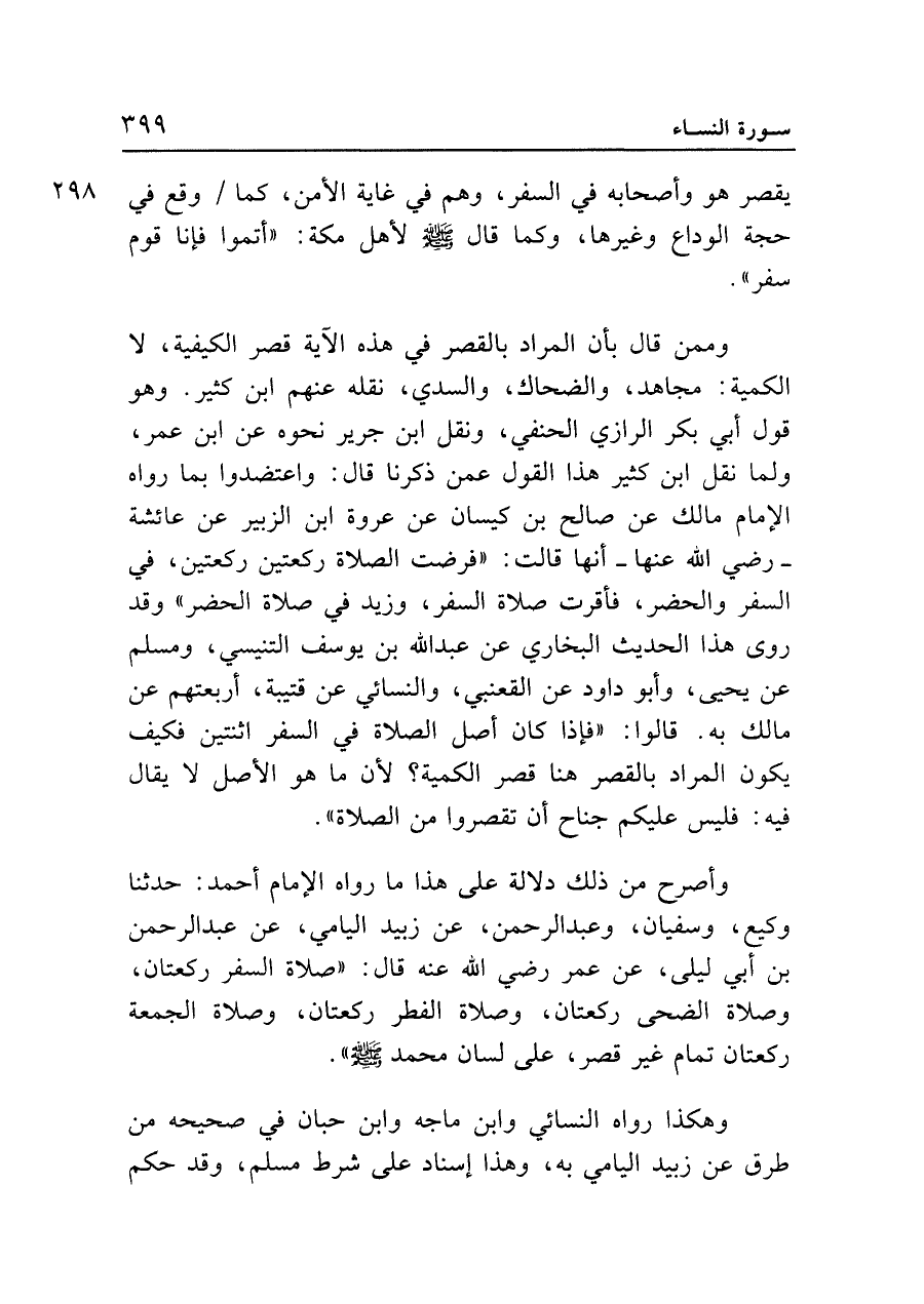 وممن قال بأن المراد بالقصر في هذه الآية قصر الكيفية، لا الكمية: مجاهد، والضحاك، والسدي، نقله عنهم ابن كثير. وهو قول أبي بكر الرازي الحنفي، ونقل ابن جرير نحوه عن ابن عمر، ولما نقل ابن كثير هذا القول عمن ذكرنا قال: واعتضدوا بما رواه الإمام مالك عن صالح بن كيسان عن عروة ابن الزبير عن عائشة - رضي الله عنها - أنها قالت: "فرضت الصلاة ركعتين ركعتين، في السفر والحضر، فأقرت صلاة السفر، وزيد في صلاة الحضر" وقد روى هذا الحديث البخاري عن عبد الله بن يوسف التنيسي، ومسلم عن يحيى، وأبو داود عن القعنبي، والنسائي عن قتيبة، أربعتهم عن مالك به. قالوا: "فإذا كان أصل الصلاة في السفر اثنتين فكيف يكون المراد بالقصر هنا قصر الكمية؟ لأن ما هو الأصل لا يقال فيه: فليس عليكم جناح أن تقصروا من الصلاة".