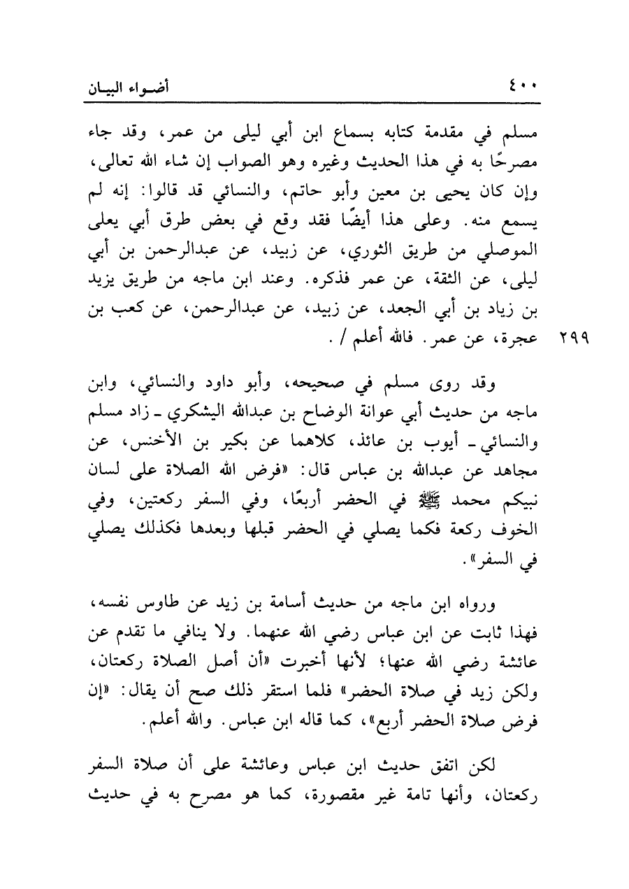 مسلم في مقدمة كتابه بسماع ابن أبي ليلى من عمر، وقد جاء مصرحا به في هذا الحديث وغيره وهو الصواب أن شاء الله تعالى، وإن كان يحيى بن معين وأبو حاتم، والنسائي قد قالوا: إنه لم يسمع منه. وعلى هذا أيضا فقد وقع في بعض طرق أبي يعلى الموصلي من طريق الثوري، عن زبيد، عن عبد الرحمن بن أبي ليلى، عن الثقة، عن عمر فذكره. وعند ابن ماجه من طريق يزيد بن زياد بن أبي الجعد، عن زبيد، عن عبد الرحمن، عن كعب بن عجرة، عن عمر. فالله أعلم.