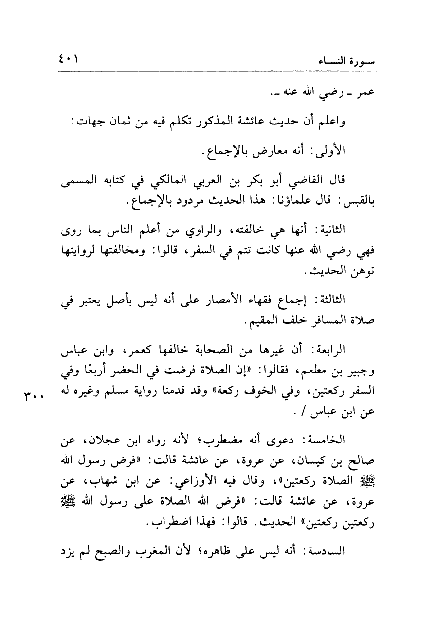 الرابعة: أن غيرها من الصحابة خالفها كعمر، وابن عباس وجبير بن مطعم، فقالوا: "إن الصلاة فرضت في الحضر أربعا وفي السفر ركعتين، وفي الخوف ركعة" وقد قدمنا رواية مسلم وغيره له عن ابن عباس.