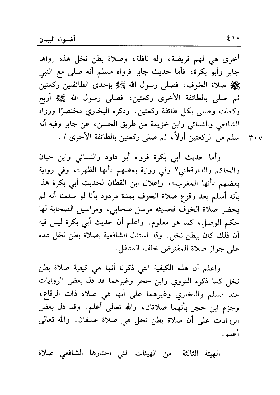 وأما حديث أبي بكرة فرواه أبو داود والنسائي وابن حبان والحاكم والدارقطني؟ وفي رواية بعضهم "أنها الظهر"، وفي رواية بعضهم "أنها المغرب"، وإعلال ابن القطان لحديث أبي بكرة هذا بأنه أسلم بعد وقوع صلاة الخوف بمدة مردود بأنا لو سلمنا أنه لم يحضر صلاة الخوف فحديثه مرسل صحابي، ومراسيل الصحابة لها حكم الوصل، كما هو معلوم. واعلم أن حديث أبي بكرة ليس فيه أن ذلك كان ببطن نخل. وقد استدل الشافعية بصلاة بطن نخل هذه على جواز صلاة المفترض خلف المتنفل.