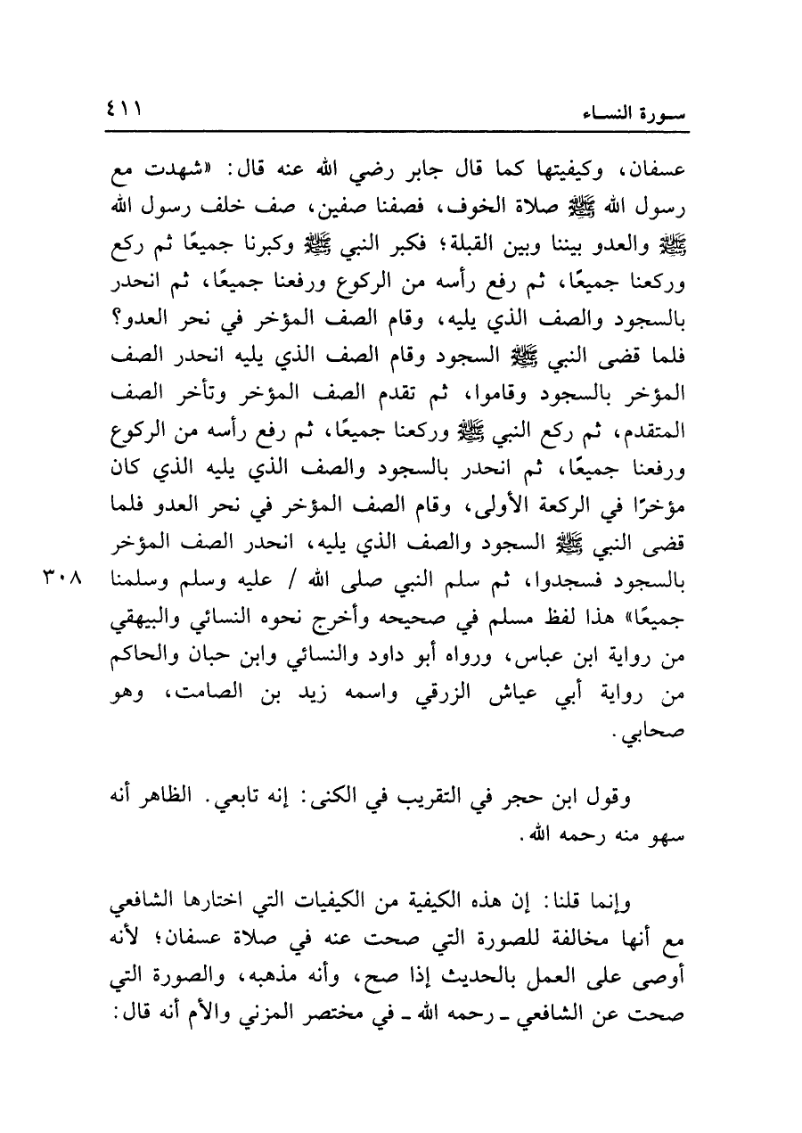 عسفان، وكيفيتها كما قال جابر رضي الله عنه قال: "شهدت مع رسول الله - صلى الله عليه وسلم - صلاة الخوف، فصفنا صفين، صف خلف رسول الله - صلى الله عليه وسلم - والعدو بيننا وبين القبلة؛ فكبر النبي - صلى الله عليه وسلم - وكبرنا جميعا ثم ركع وركعنا جميعا، ثم رفع رأسه من الركوع ورفعنا جميعا، ثم انحدر بالسجود والصف الذي يليه، وقام الصف المؤخر في نحر العدو؟ فلما قضى النبي - صلى الله عليه وسلم - السجود وقام الصف الذي يليه انحدر الصف المؤخر بالسجود وقاموا، ثم تقدم الصف المؤخر وتأخر الصف المتقدم، ثم ركع النبي - صلى الله عليه وسلم - وركعنا جميعا، ثم رفع رأسه من الركوع ورفعنا جميعا، ثم انحدر بالسجود والصف الذي يليه الذي كان مؤخرا في الركعة الأولى، وقام الصف المؤخر في نحر العدو فلما قضى النبي - صلى الله عليه وسلم - السجود والصف الذي يليه، انحدر الصف المؤخر بالسجود فسجدوا، ثم سلم النبي صلى الله عليه وسلم وسلمنا جميعا" هذا لفظ مسلم في صحيحه وأخرج نحوه النسائي والبيهقي من رواية ابن عباس، ورواه أبو داود والنسائي وابن حبان والحاكم من رواية أبي عياش الزرقي واسمه زيد بن الصامت، وهو صحابي.