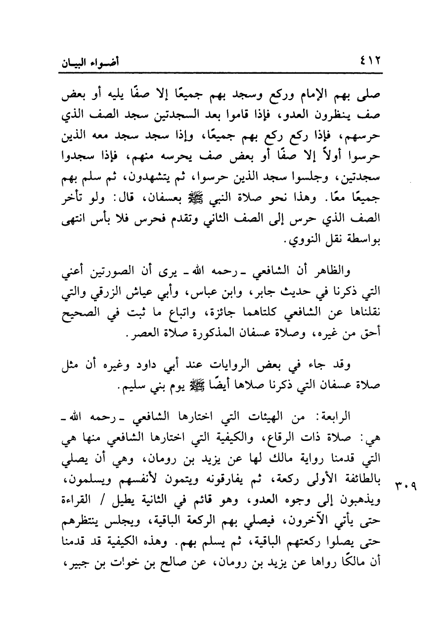 الرابعة: من الهيئات التي اختارها الشافعي -رحمه الله- هي: صلاة ذات الرقاع، والكيفية التي اختارها الشافعي منها هي التي قدمنا رواية مالك لها عن يزيد بن رومان، وهي أن يصلي بالطائفة الأولى ركعة، ثم يفارقونه ويتمون لأنفسهم ويسلمون، ويذهبون إلى وجوه العدو، وهو قائم في الثانية يطيل القراءة حتى يأتي الآخرون، فيصلي بهم الركعة الباقية، ويجلس ينتظرهم حتى يصلوا ركعتهم الباقية، ثم يسلم بهم. وهذه الكيفية قد قدمنا أن مالكا رواها عن يزيد بن رومان، عن صالح بن خوات بن جبير،