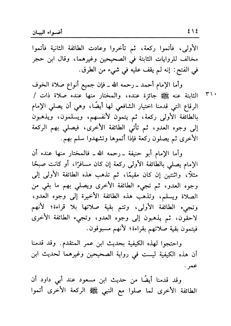 وأما الإمام أحمد -رحمه الله- فإن جميع أنواع صلاة الخوف الثابتة عنه - صلى الله عليه وسلم - جائزة عنده، والمختار منها عنده صلاة ذات الرقاع التي قدمنا اختيار الشافعي أنها أيضا، وهي أن يصلي الإمام بالطائفة الأولى ركعة، ثم يتمون لأنفسهم، ويسلمون، ويذهبون إلى وجوه العدو، ثم تأتي الطائفة الأخرى، فيصلي بهم الركعة الأخرى ثم يصلون ركعة فإذا أتموها وتشهدوا سلم بهم.
