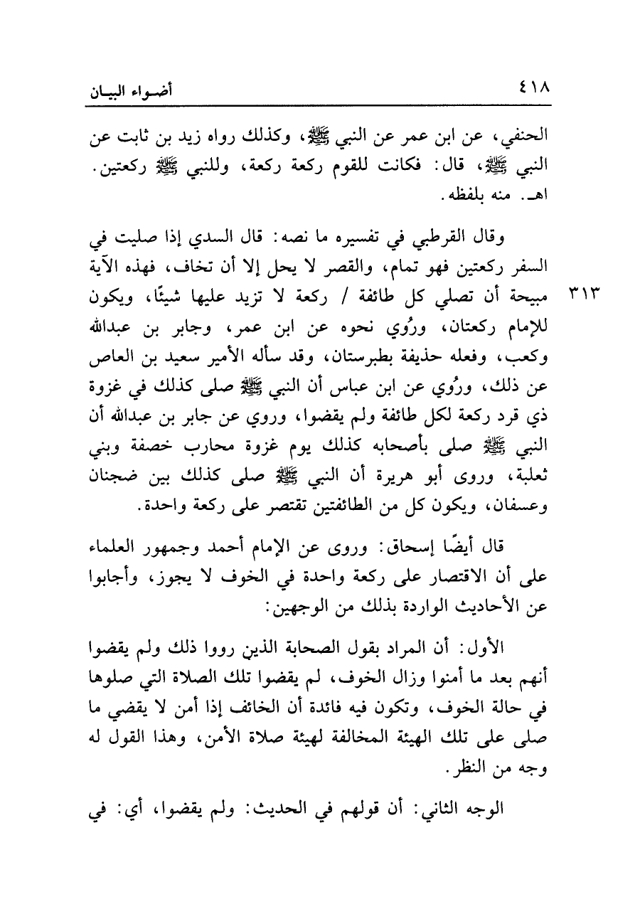 وقال القرطبي في تفسيره ما نصه: قال السدي إذا صليت في السفر ركعتين فهو تمام، والقصر لا يحل إلا أن تخاف، فهذه الآية مبيحة أن تصلي كل طائفة ركعة لا تزيد عليها شيئا، ويكون للإمام ركعتان، وروي نحوه عن ابن عمر، وجابر بن عبد الله وكعب، وفعله حذيفة بطبرستان، وقد سأله الأمير سعيد بن العاص عن ذلك، وروي عن ابن عباس أن النبي - صلى الله عليه وسلم - صلى كذلك في غزوة ذي قرد ركعة لكل طائفة ولم يقضوا، وروي عن جابر بن عبد الله أن النبي - صلى الله عليه وسلم - صلى بأصحابه كذلك يوم غزوة محارب خصفة وبني ثعلبة، وروى أبو هريرة أن النبي - صلى الله عليه وسلم - صلى كذلك بين ضجنان وعسفان، ويكون كل من الطائفتين تقتصر على ركعة واحدة.