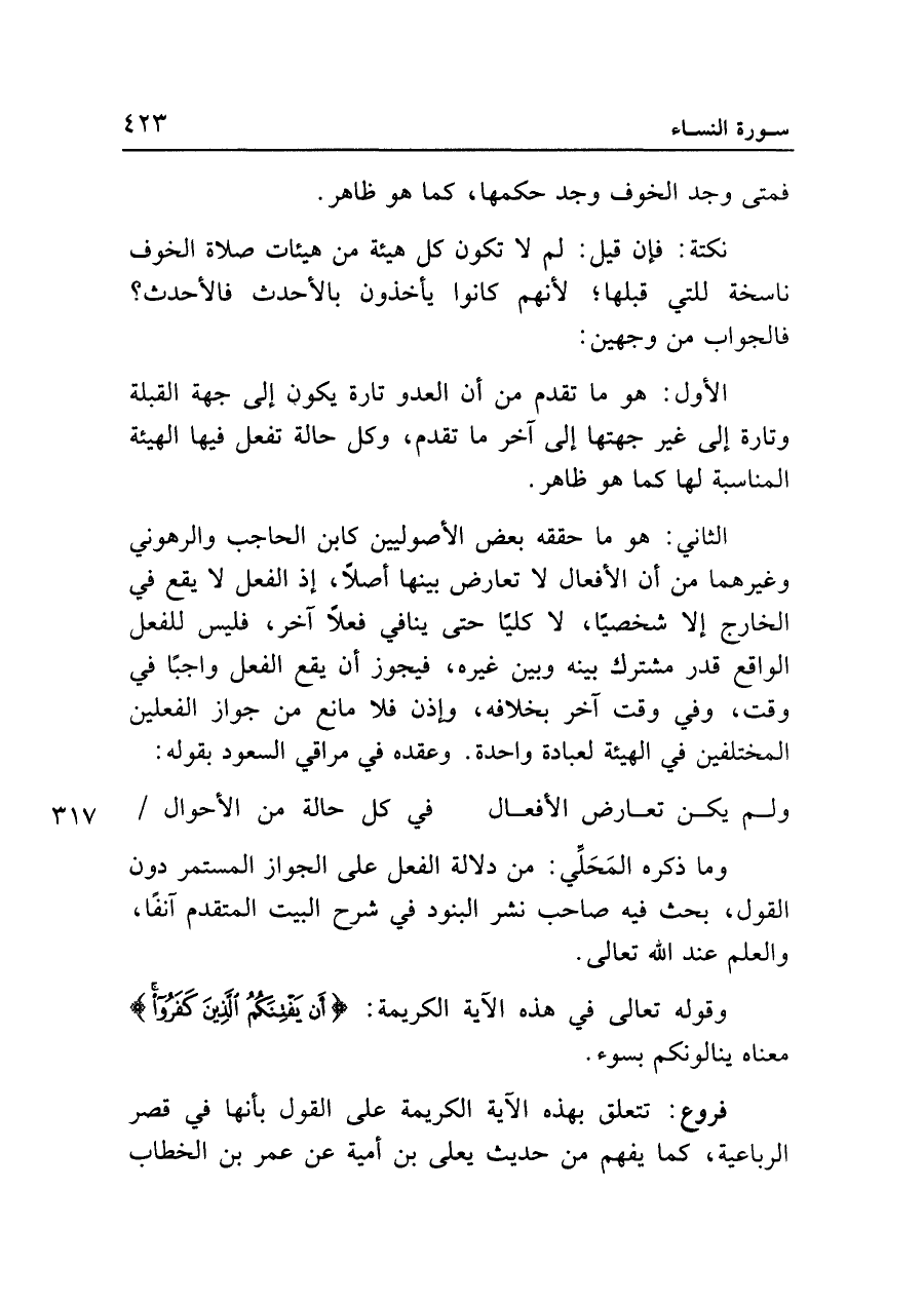 نكتة: فإن قيل: لم لا تكون كل هيئة من هيئات صلاة الخوف ناسخة للتي قبلها؛ لأنهم كانوا يأخذون بالأحدث فالأحدث؟ فالجواب من وجهين: