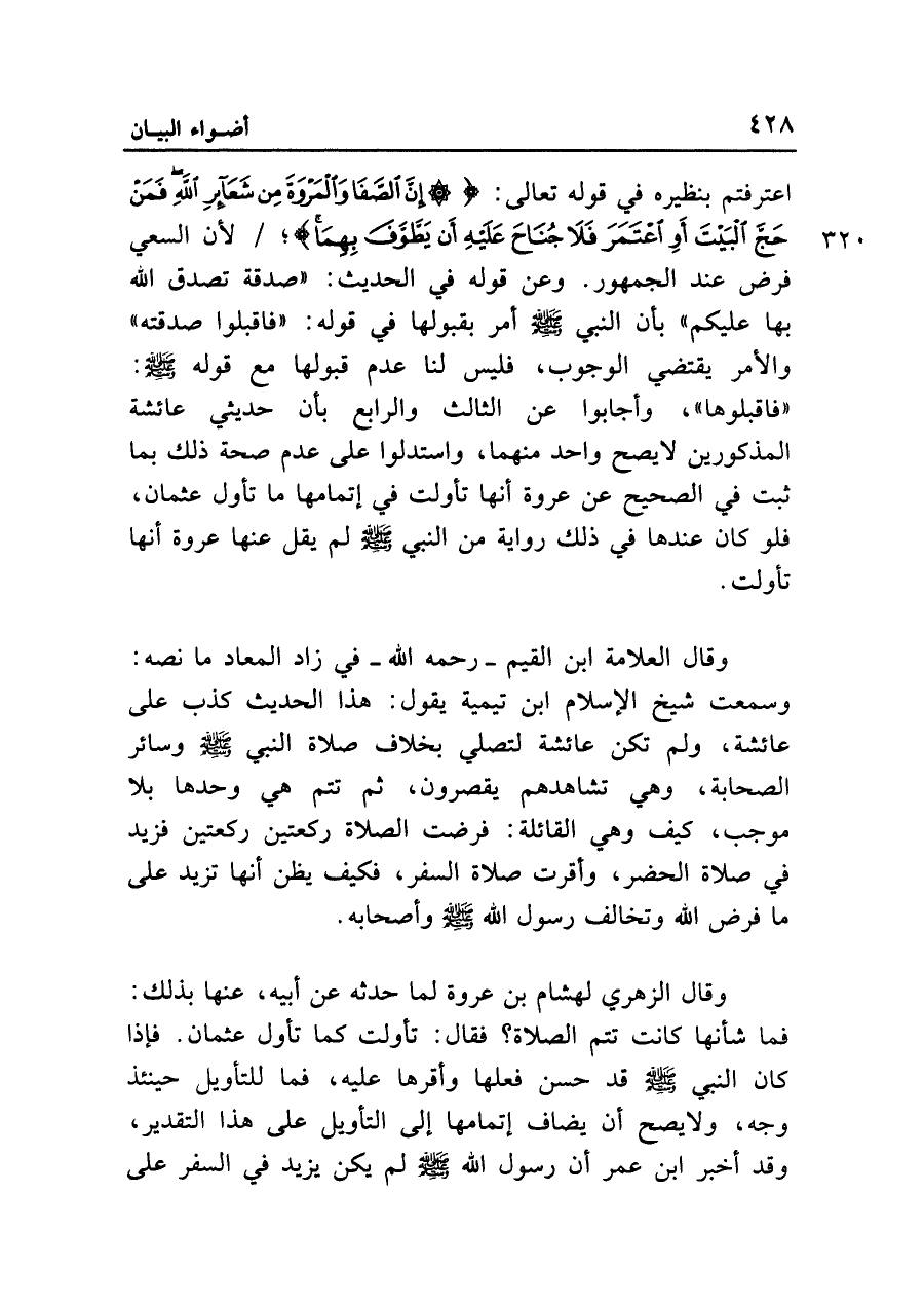 اعترفتم بنظيره في قوله تعالى: {إِنَّ الصَّفَا وَالْمَرْوَةَ مِنْ شَعَائِرِ اللَّهِ فَمَنْ حَجَّ الْبَيْتَ أَوِ اعْتَمَرَ فَلا جُنَاحَ عَلَيْهِ أَنْ يَطَّوَّفَ بِهِمَا}؛ لأن السعي فرض عند الجمهور. وعن قوله في الحديث: "صدقة تصدق الله بها عليكم" بأن النبي - صلى الله عليه وسلم - أمر بقبولها في قوله: "فاقبلوا صدقته" والأمر يقتضي الوجوب، فليس لنا عدم قبولها مع قوله - صلى الله عليه وسلم -: "فاقبلوها"، وأجابوا عن الثالث والرابع بأن حديثي عائشة المذكورين لايصح واحد منهما، واستدلوا على عدم صحة ذلك بما ثبت في الصحيح عن عروة أنها تأولت في إتمامها ما تأول عثمان، فلو كان عندها في ذلك رواية من النبي - صلى الله عليه وسلم - لم يقل عنها عروة أنها تأولت.