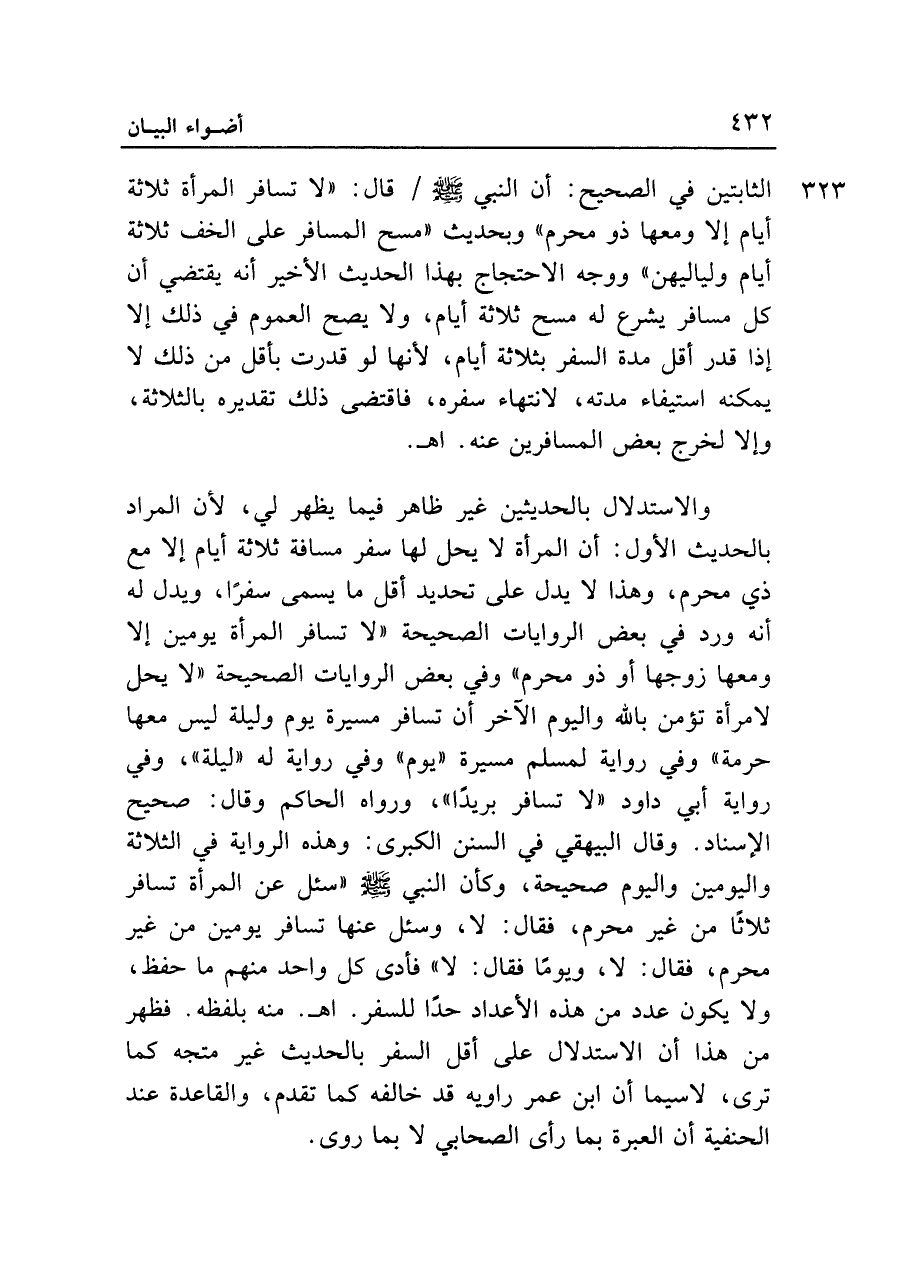الثابتين في الصحيح: أن النبي - صلى الله عليه وسلم - قال: "لا تسافر المرأة ثلاثة أيام إلا ومعها ذو محرم" وبحديث "مسح المسافر على الخف ثلاثة أيام ولياليهن" ووجه الاحتجاج بهذا الحديث الأخير أنه يقتضي أن كل مسافر يشرع له مسح ثلاثة أيام، ولا يصح العموم في ذلك إلا إذا قدر أقل مدة السفر بثلاثة أيام، لأنها لو قدرت بأقل من ذلك لا يمكنه استيفاء مدته، لانتهاء سفره، فاقتضى ذلك تقديره بالثلاثة، وإلا لخرج بعض المسافرين عنه. اهـ.