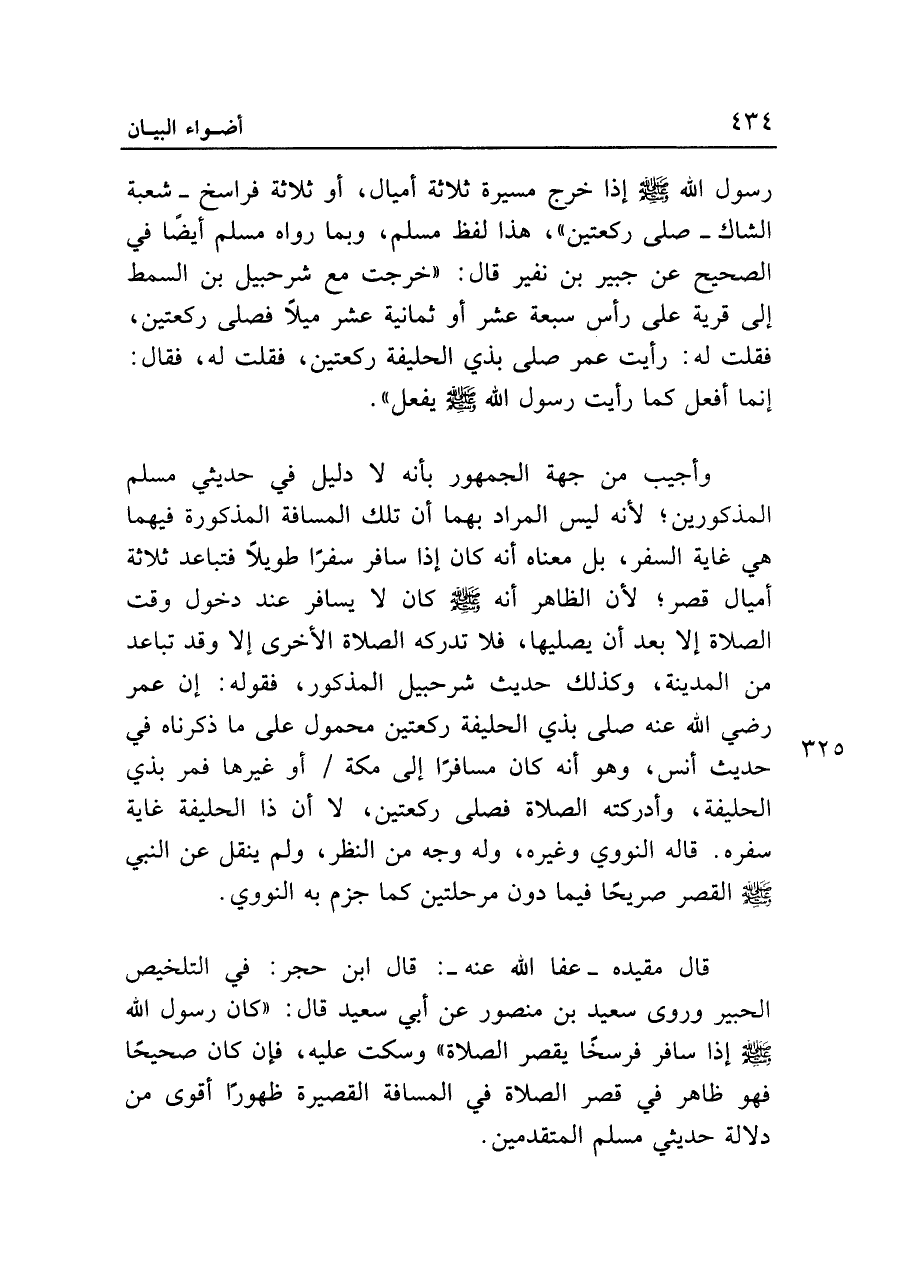 قال مقيده - عفا الله عنه -: قال ابن حجر: في التلخيص الحبير وروى سعيد بن منصور عن أبي سعيد قال: "كان رسول الله - صلى الله عليه وسلم - إذا سافر فرسخا يقصر الصلاة" وسكت عليه، فإن كان صحيحا فهو ظاهر في قصر الصلاة في المسافة القصيرة ظهورا أقوى من دلالة حديثي مسلم المتقدمين.