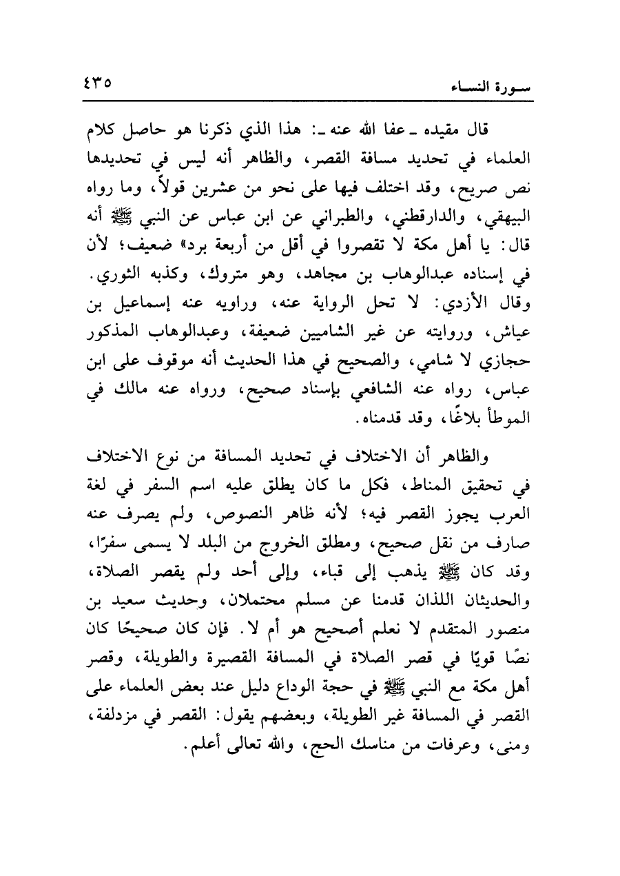 قال مقيده - عفا الله عنه -: هذا الذي ذكرنا هو حاصل كلام العلماء في تحديد مسافة القصر، والظاهر أنه ليس في تحديدها نص صريح، وقد اختلف فيها على نحو من عشرين قولا، وما رواه البيهقي، والدارقطني، والطبراني عن ابن عباس عن النبي - صلى الله عليه وسلم - أنه قال: ياأهل مكة لا تقصروا في أقل من أربعة برد" ضعيف؛ لأن في إسناده عبد الوهاب بن مجاهد، وهو متروك، وكذبه الثوري. وقال الأزدي: لا تحل الرواية عنه، وراويه عنه إسماعيل بن عياش، وروايته عن غير الشاميين ضعيفة، وعبد الوهاب المذكور حجازي لا شامي، والصحيح في هذا الحديث أنه موقوف على ابن عباس، رواه عنه الشافعي بإسناد صحيح، ورواه عنه مالك في الموطأ بلاغا، وقد قدمناه.