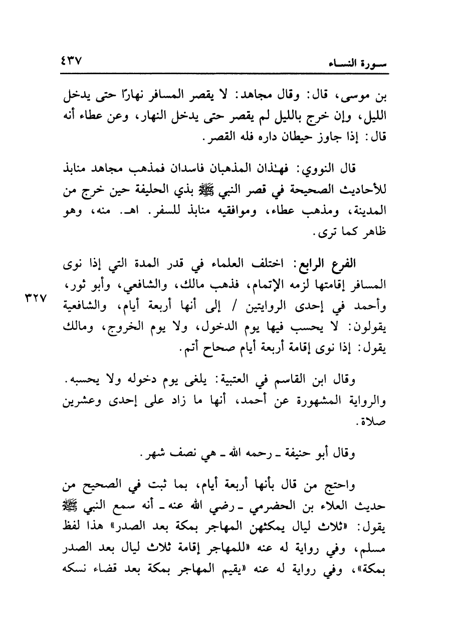 الفرع الرابع: اختلف العلماء في قدر المدة التي إذا نوى المسافر إقامتها لزمه الإتمام، فذهب مالك، والشافعي، وأبو ثور، وأحمد في إحدى الروايتين إلى أنها أربعة أيام، والشافعية يقولون: لا يحسب فيها يوم الدخول، ولا يوم الخروج، ومالك يقول: إذا نوى إقامة أربعة أيام صحاح أتم.