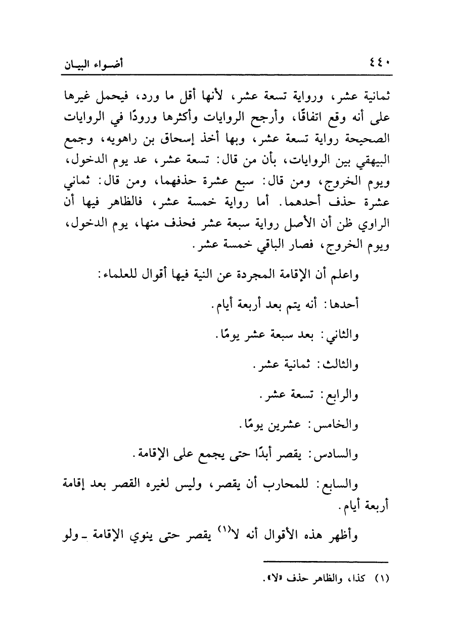 ثمانية عشر، ورواية تسعة عشر، لأنها أقل ما ورد، فيحمل غيرها على أنه وقع اتفاقا، وأرجح الروايات وأكثرها ورودا في الروايات الصحيحة رواية تسعة عشر، وبها أخذ إسحاق بن راهويه، وجمع البيهقي بين الروايات، بأن من قال: تسعة عشر، عد يوم الدخول، ويوم الخروج، ومن قال: سبع عشرة حذفهما، ومن قال: ثماني عشرة حذف أحدهما. أما رواية خمسة عشر، فالظاهر فيها أن الراوي ظن أن الأصل رواية سبعة عشر فحذف منها، يوم الدخول، ويوم الخروج، فصار الباقي خمسة عشر.