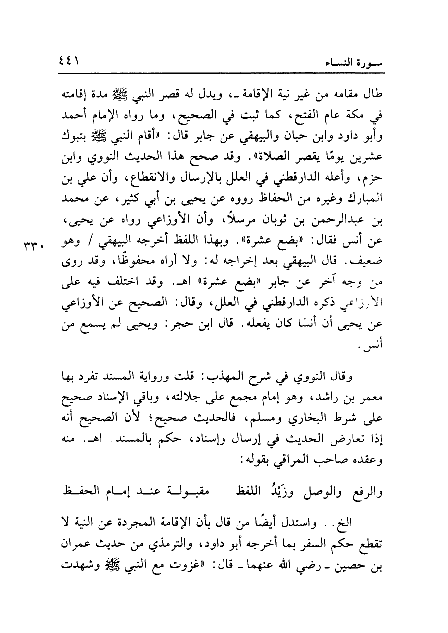 طال مقامه من غير نية الإقامة-، ويدل له قصر النبي - صلى الله عليه وسلم - مدة إقامته في مكة عام الفتح، كما ثبت في الصحيح، وما رواه الإمام أحمد وأبو داود وابن حبان والبيهقي عن جابر قال: "أقام النبي - صلى الله عليه وسلم - بتبوك عشرين يوما يقصر الصلاة". وقد صحح هذا الحديث النووي وابن حزم، وأعله الدارقطني في العلل بالإرسال والانقطاع، وأن علي بن المبارك وغيره من الحفاظ رووه عن يحيى بن أبي كثير، عن محمد بن عبد الرحمن بن ثوبان مرسلا، وأن الأوزاعي رواه عن يحيى، عن أنس فقال: "بضع عشرة". وبهذا اللفظ أخرجه البيهقي وهو ضعيف. قال البيهقي بعد إخراجه له: ولا أراه محفوظا، وقد روي من وجه آخر عن جابر "بضع عشرة" اهـ. وقد اختلف فيه على الأوزاعي ذكره الدارقطني في العلل، وقال: الصحيح عن الأوزاعي عن يحيى أن أنسا كان يفعله. قال ابن حجر: ويحيى لم يسمع من أنس.