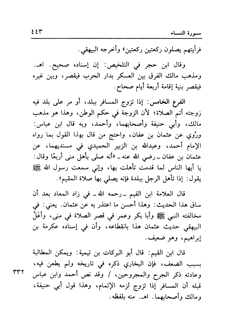 الفرع الخامس: إذا تزوج المسافر ببلد، أو مر على بلد فيه زوجته أتم الصلاة؛ لأن الزوجة في حكم الوطن، وهذا هو مذهب مالك، وأبي حنيفة وأصحابهما، وأحمد، وبه قال ابن عباس: وروي عن عثمان بن عفان، واحتج من قال بهذا القول بما رواه الإمام أحمد، وعبد الله بن الزبير الحميدي في مسنديهما، عن عثمان بن عفان - رضي الله عنه - "أنه صلى بأهل منى أربعا وقال: يا أيها الناس لما قدمت تأهلت بها، وإني سمعت رسول الله - صلى الله عليه وسلم - يقول: إذا تأهل الرجل ببلده فإنه يصلي بها صلاة المقيم".