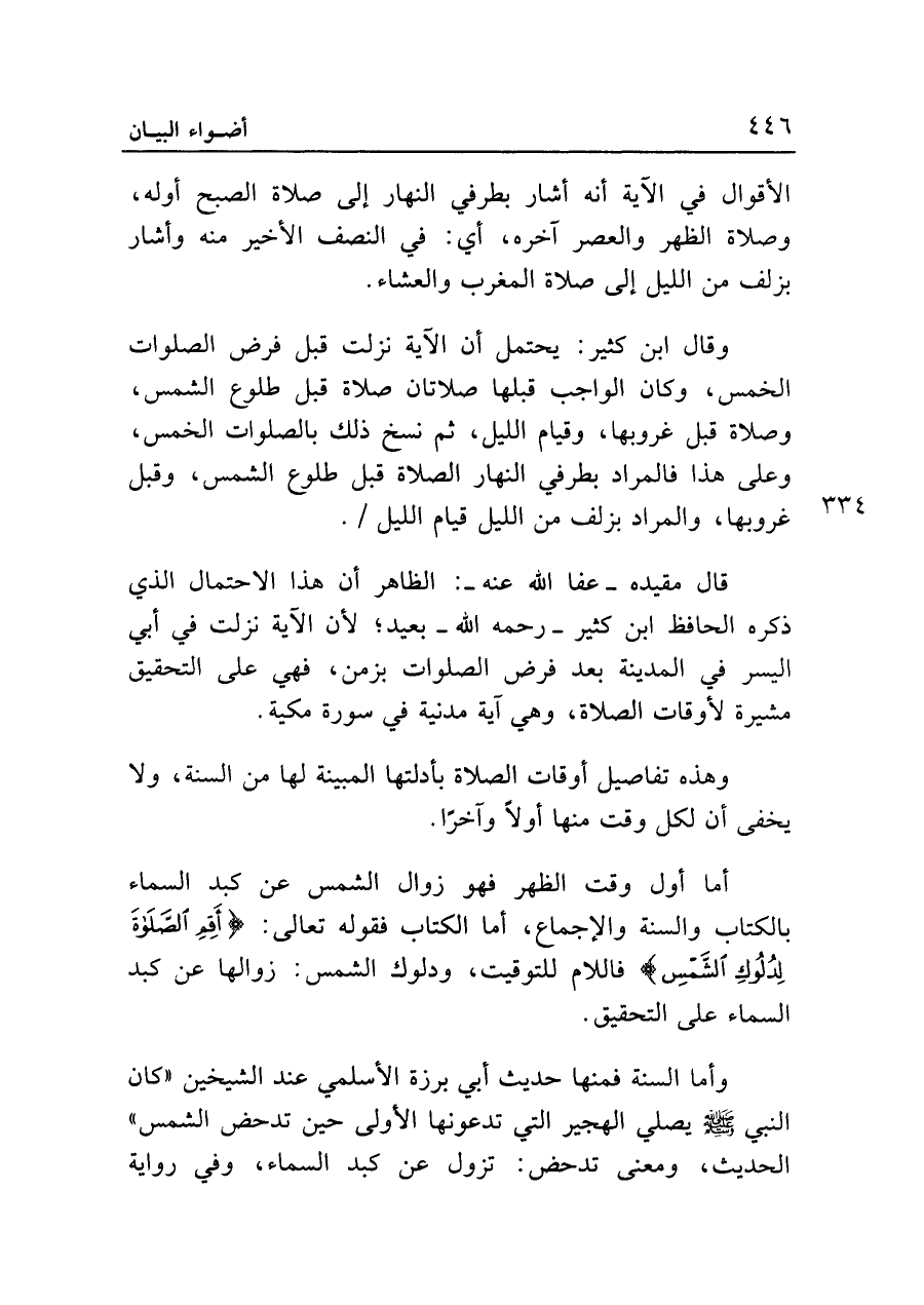 قال مقيده - عفا الله عنه -: الظاهر أن هذا الاحتمال الذي ذكره الحافظ ابن كثير -رحمه الله- بعيد؛ لأن الآية نزلت في أبي اليسر في المدينة بعد فرض الصلوات بزمن، فهي على التحقيق مشيرة لأوقات الصلاة، وهي آية مدنية في سورة مكية.