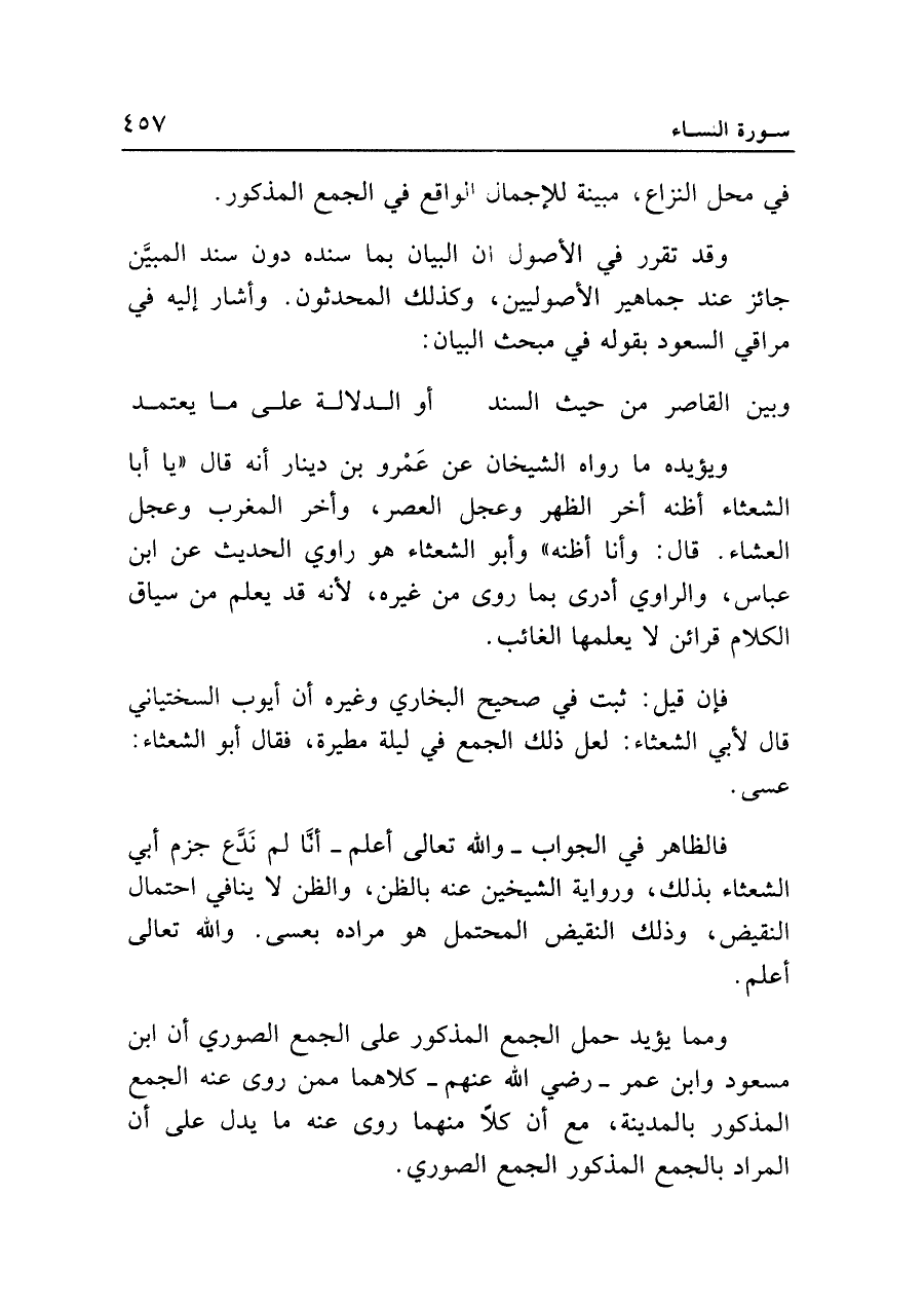ومما يؤيد حمل الجمع المذكور على الجمع الصوري أن ابن مسعود وابن عمر -رضي الله عنهم- كلاهما ممن روى عنه الجمع المذكور بالمدينة، مع أن كلا منهما روى عنه ما يدل على أن المراد بالجمع المذكور الجمع الصوري.