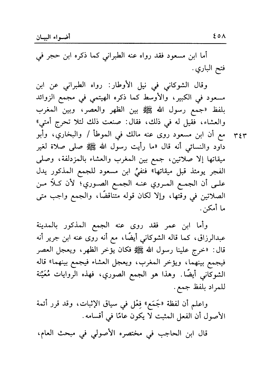 وقال الشوكاني في نيل الأوطار: رواه الطبراني عن ابن مسعود في الكبير، والأوسط كما ذكره الهيتمي في مجمع الزوائد بلفظ "جمع رسول الله - صلى الله عليه وسلم - بين الظهر والعصر، وبين المغرب والعشاء، فقيل له في ذلك، فقال: صنعت ذلك لئلا تحرج أمتي" مع أن ابن مسعود روى عنه مالك في الموطأ والبخاري، وأبو داود والنسائي أنه قال "ما رأيت رسول الله - صلى الله عليه وسلم - صلى صلاة لغير ميقاتها إلا صلاتين، جمع بين المغرب والعشاء بالمزدلفة، وصلى الفجر يومئذ قبل ميقاتها" فنفي ابن مسعود للجمع المذكور يدل على أن الجمع المروي عنه الجمع الصوري؛ لأن كلا من الصلاتين في وقتها، وإلا لكان قوله متناقضا، والجمع واجب متى ما أمكن.